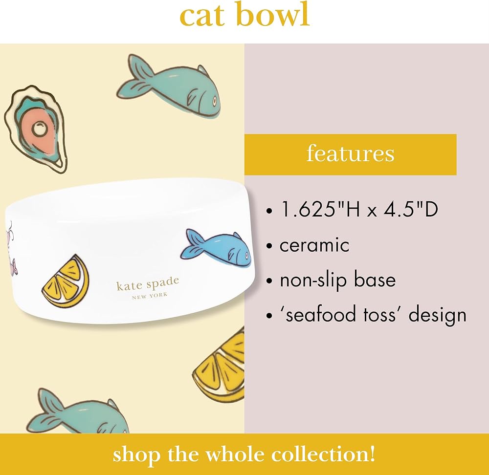 Kate Spade New York Cat Bowl ، وعاء للحيوانات الأليفة الخزفية المتينة للطعام والماء ، ومأكولات البحرية