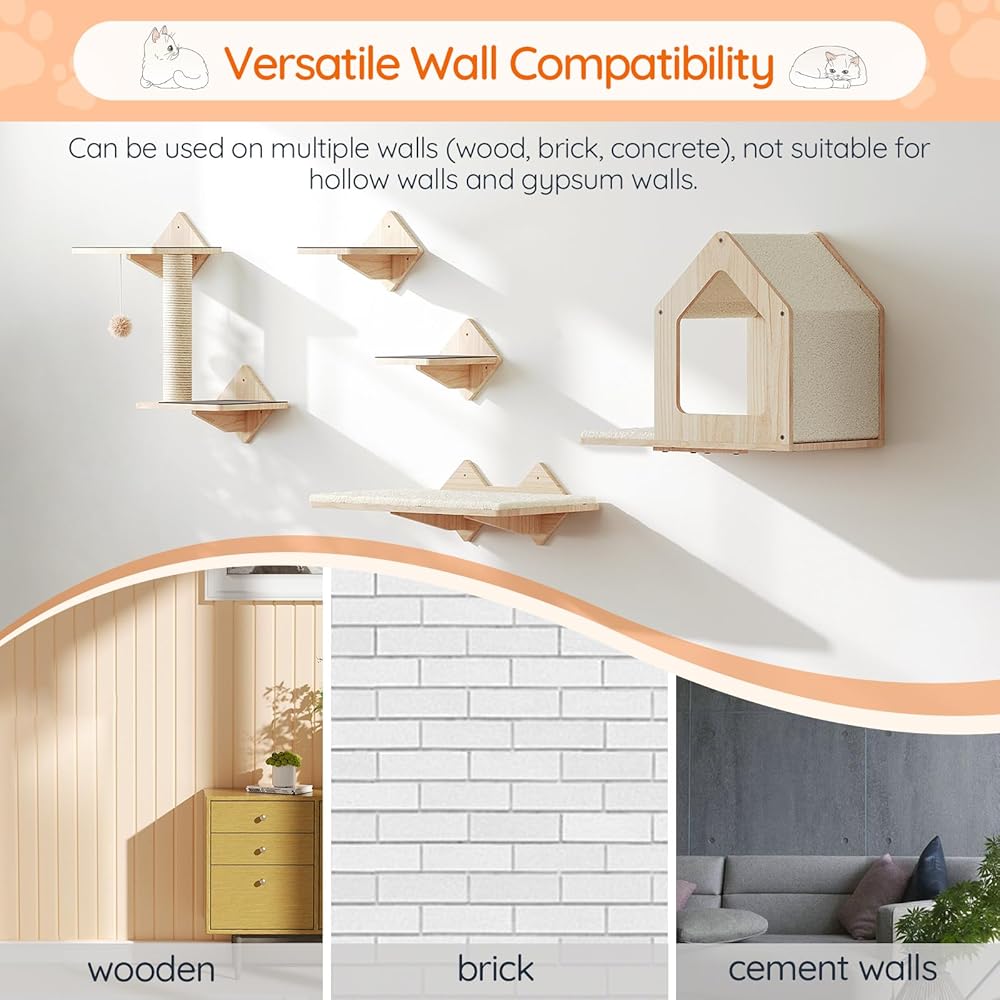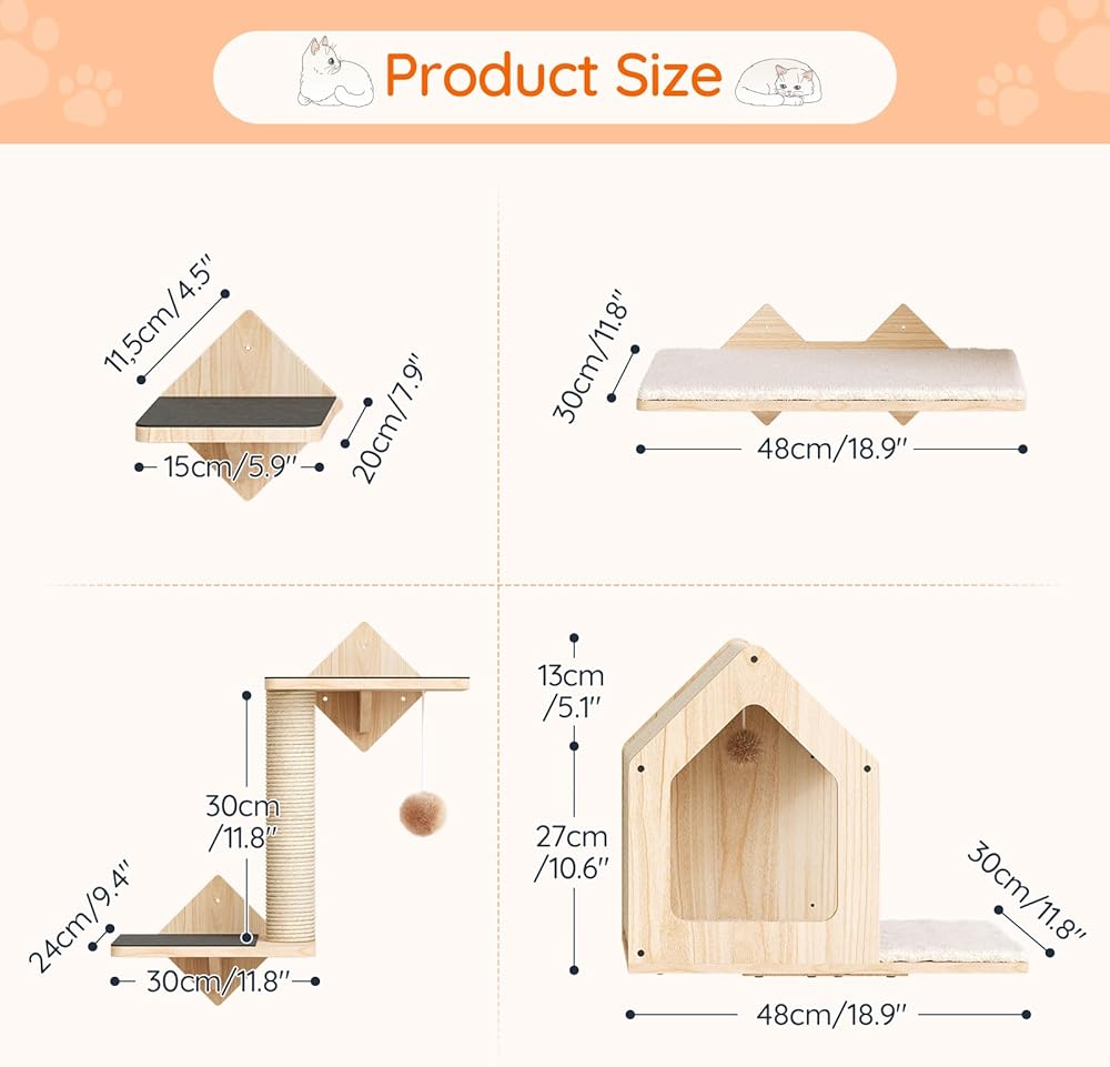• الخشب الصلب ، البناء القوي: مصنوع من الخشب الصلب المتميز والنسيج الناعم ، هذه المجموعة المكونة من 5 أرفف حائط القط ليست جميلة فقط بشكل طبيعي ولكنها تضمن أيضًا الاستقرار وطول العمر ، مع الاستخدام المتكرر من قبل قطتك المحببة (ملاحظة: لا ينصح بالاستخدام على جدران الجبس.