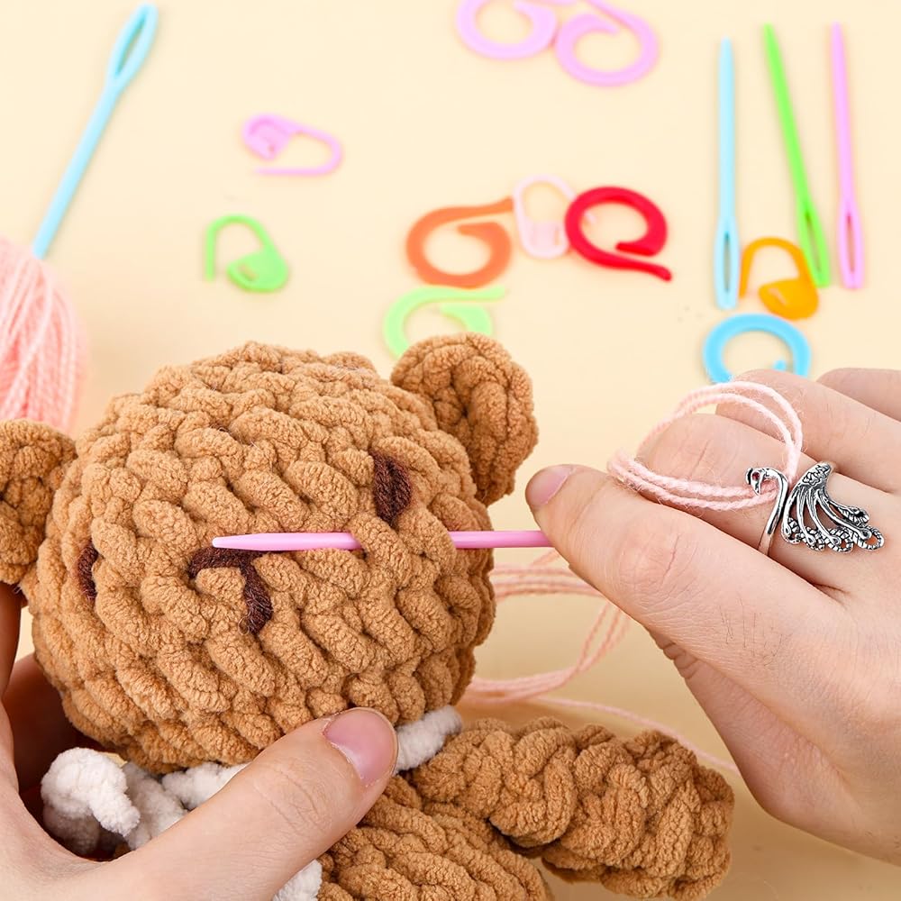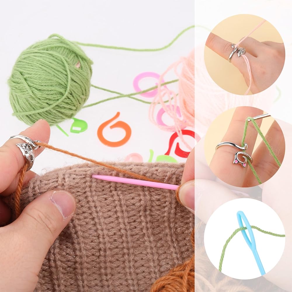 44 Pcs Crochet Ring Kit Knitting Beginners Yarn Guide Holder Weaving Finger Hook Loop Wide Open Braided Tension Rings Crocheting Thimble with Large Eye Plastic Sewing Needles Stitching Marker