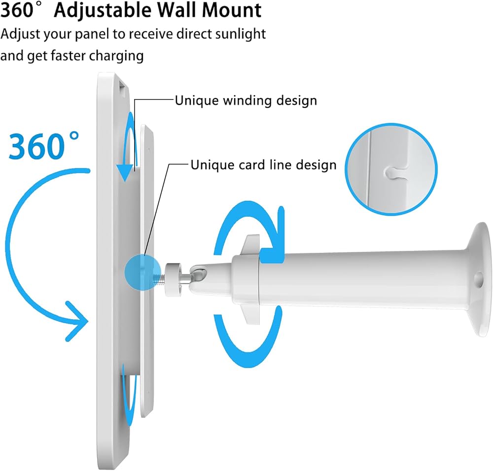 يمكن ضبط دعامة التثبيت الآمنة بزاوية 360 درجة لالتقاط ضوء الشمس في المواسم المختلفة، مما يسمح للوحة الشمسية بامتصاص المزيد من الطاقة من اتجاهات مختلفة. شاحن اللوحة الشمسية مزود بكابل بطول 13 قدمًا (4 أمتار)، وهو طويل بما يكفي للسماح لك بوضع هاتفك الألواح الشمسية في وضع أكثر حساسية للضوء لامتصاص المزيد من أشعة الشمس. تعتبر الأسطح والأبواب وجذوع الأشجار والجدران أماكن جيدة.