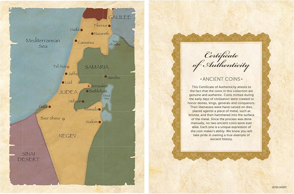 AUTHENTIC BRONZE COIN - A genuine Widows Mite Coin made of bronze and circulated during the Biblical age of the New Testament is housed in a protective portfolio. The portfolio measures approximately 6" x 8" x 1/8" and weighs about 2 ounces. It has a 1 Year Manufacturer Warranty and comes with a Certificate of Authenticity.