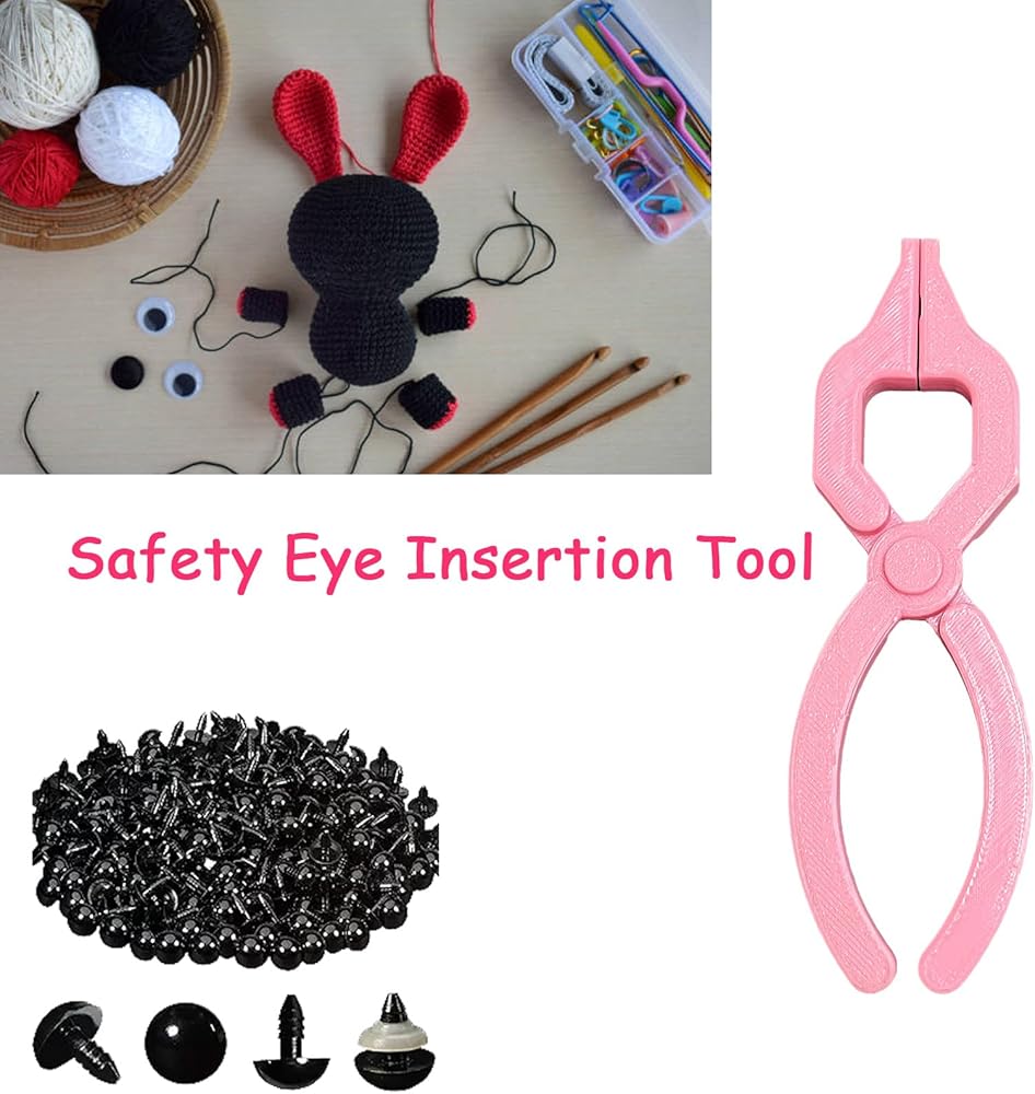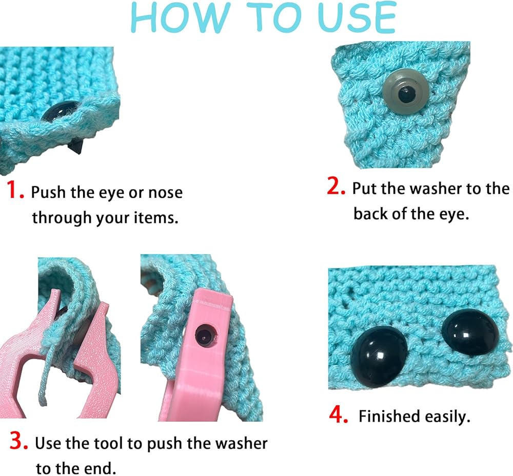 • EASY TO USE: First insert the safety eye into your plush, then place the back washer onto the eye, finally align it with the pliers' hole, squeeze to secure. Please refer to the video for specific usage methods.