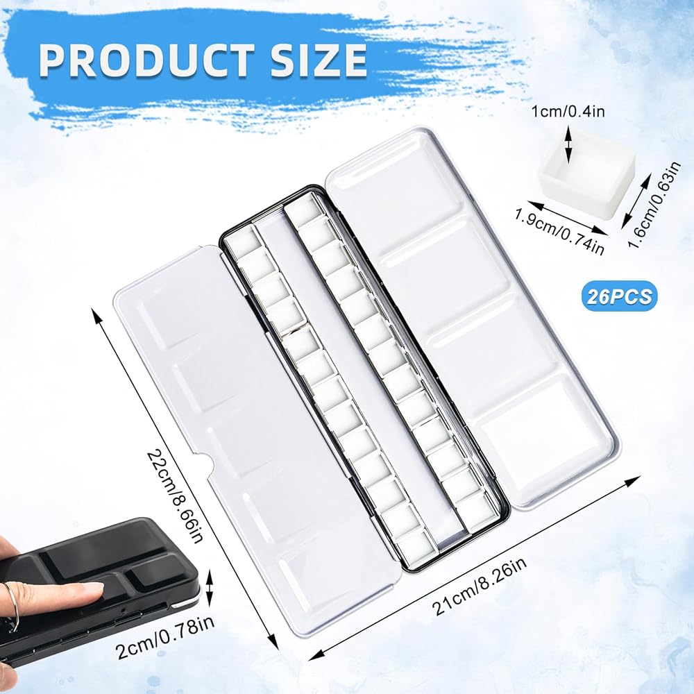Package Contents: You will receive 26 empty paint palette, 1 metal box and 1 black storage bag, which you can use to create art, can be very good to meet your needs.