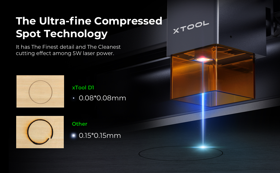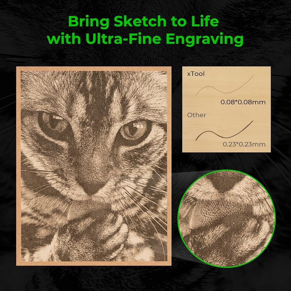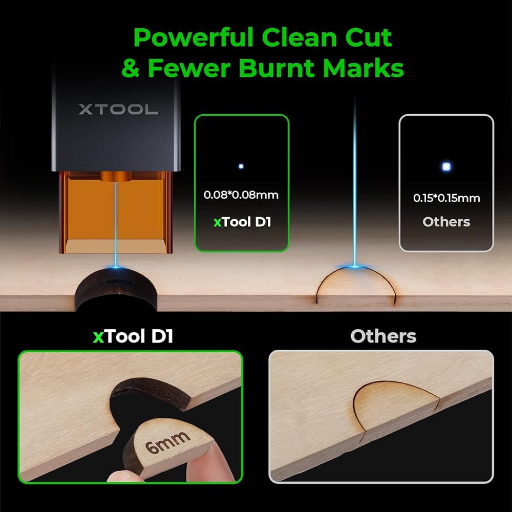 نقش عالي الدقة مع بقعة فائقة الدقة: مزودة ببقعة ليزر فائق 0.08 مم × 0.08 مم ، يوفر XTool D1 5W نقشات مفصلة على الخشب والمعادن والأسطح الأخرى ذات علامات الحرق الدنيا. مع سرعة معالجة تصل إلى 400 مم/ثانية (24000 مم/دقيقة) ، فإنه يضمن نتائج سريعة ودقيقة للتصميمات المعقدة.