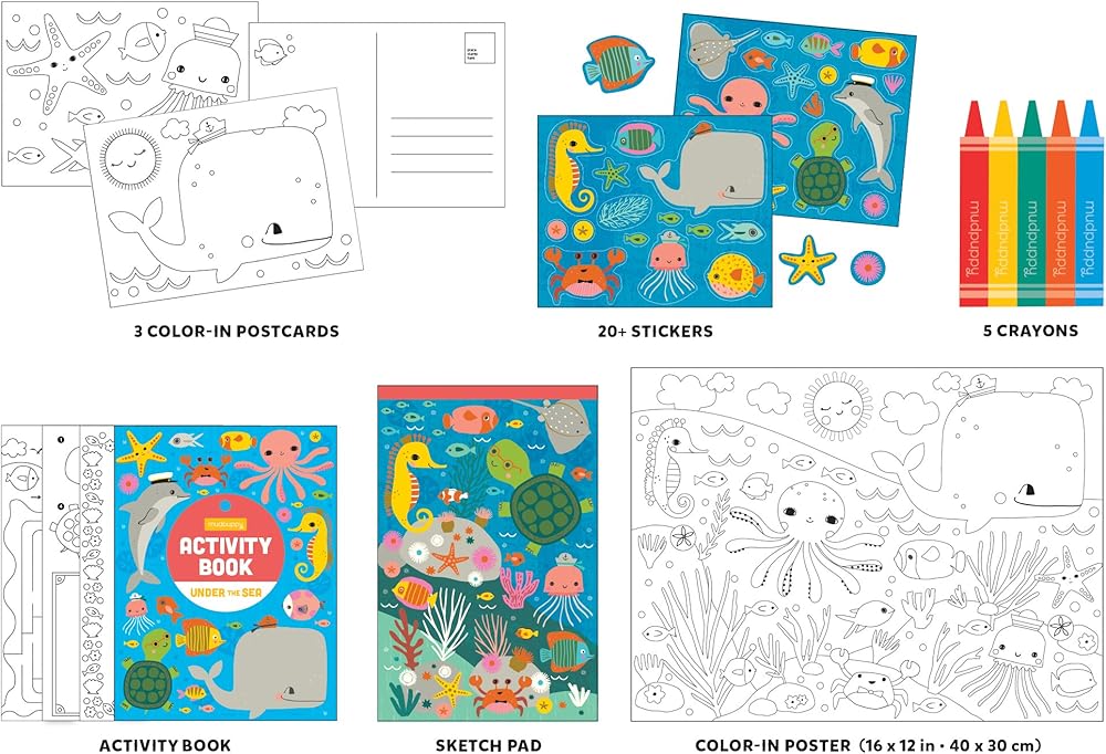 Contain 3 color-in postcards, over 20 stickers, sketch pad, activity book, color-in poster, and 5 crayons!