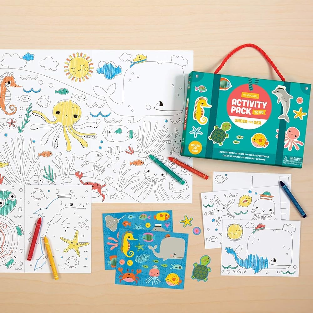 Packaged in an adorable mini-suitcase package with carry handle, this portable package of underwater activities is perfect for travel, parties, or individual fun at home. Mudpuppy's Activity Packs To Go contain 3 color-in postcards, over 20 stickers, sketch pad, activity book, color-in poster, and 5 crayons!.