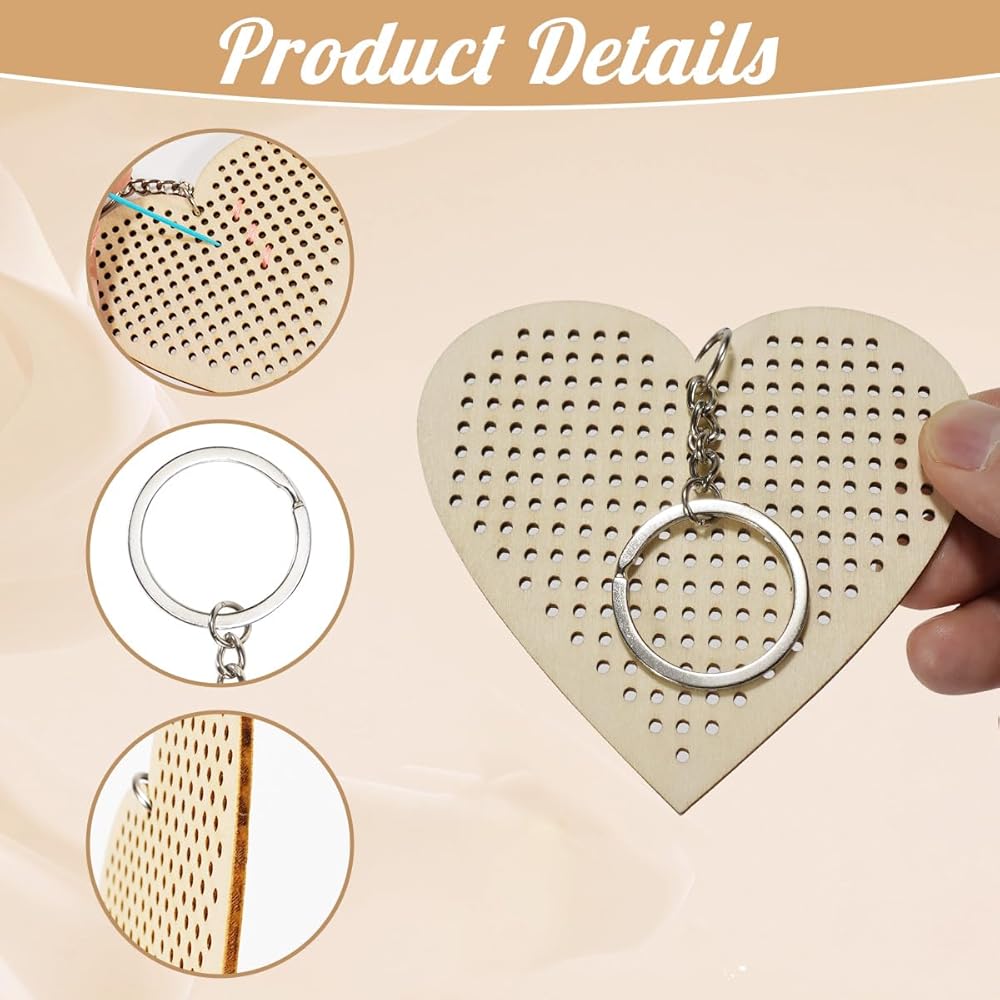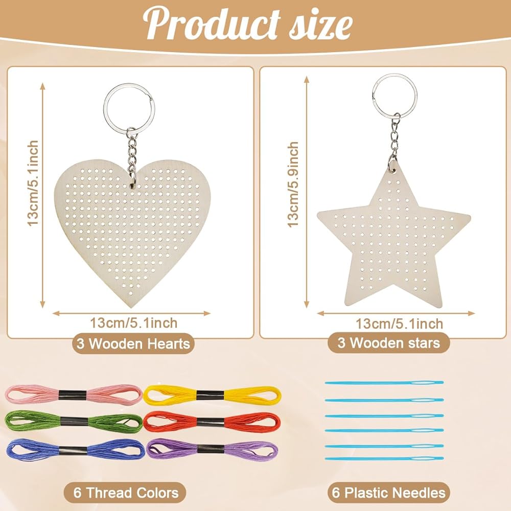 Package: you will get 6 pieces wooden cross stitch (including 3 pieces heart shapes and 3 pieces star shapes), 6 pieces keyrings, 6 pieces plastic needles and 6 pieces threads