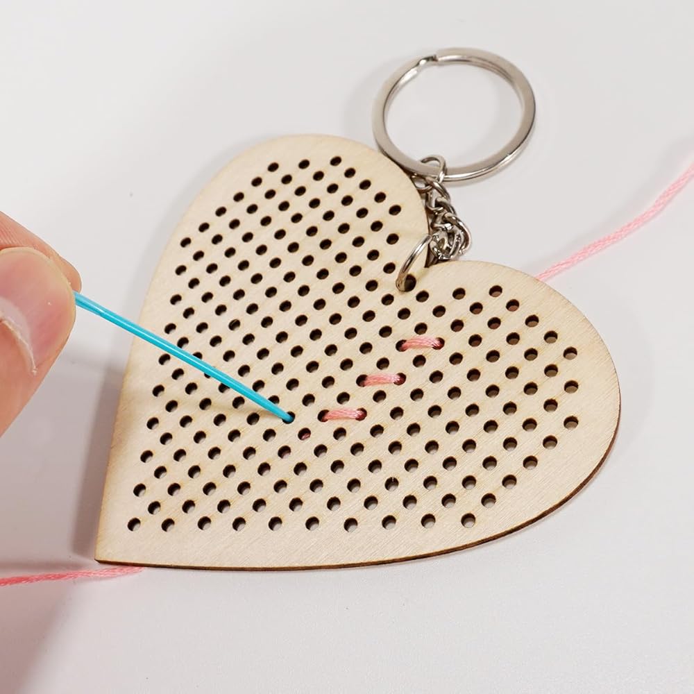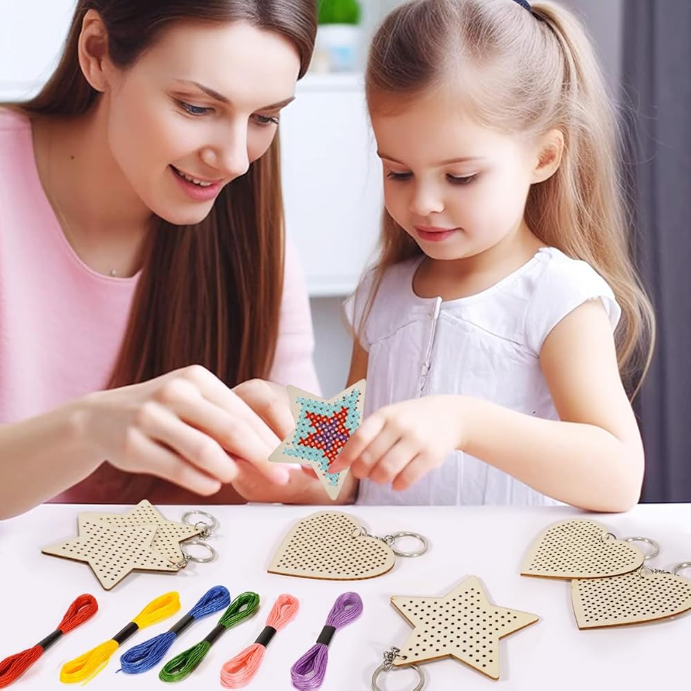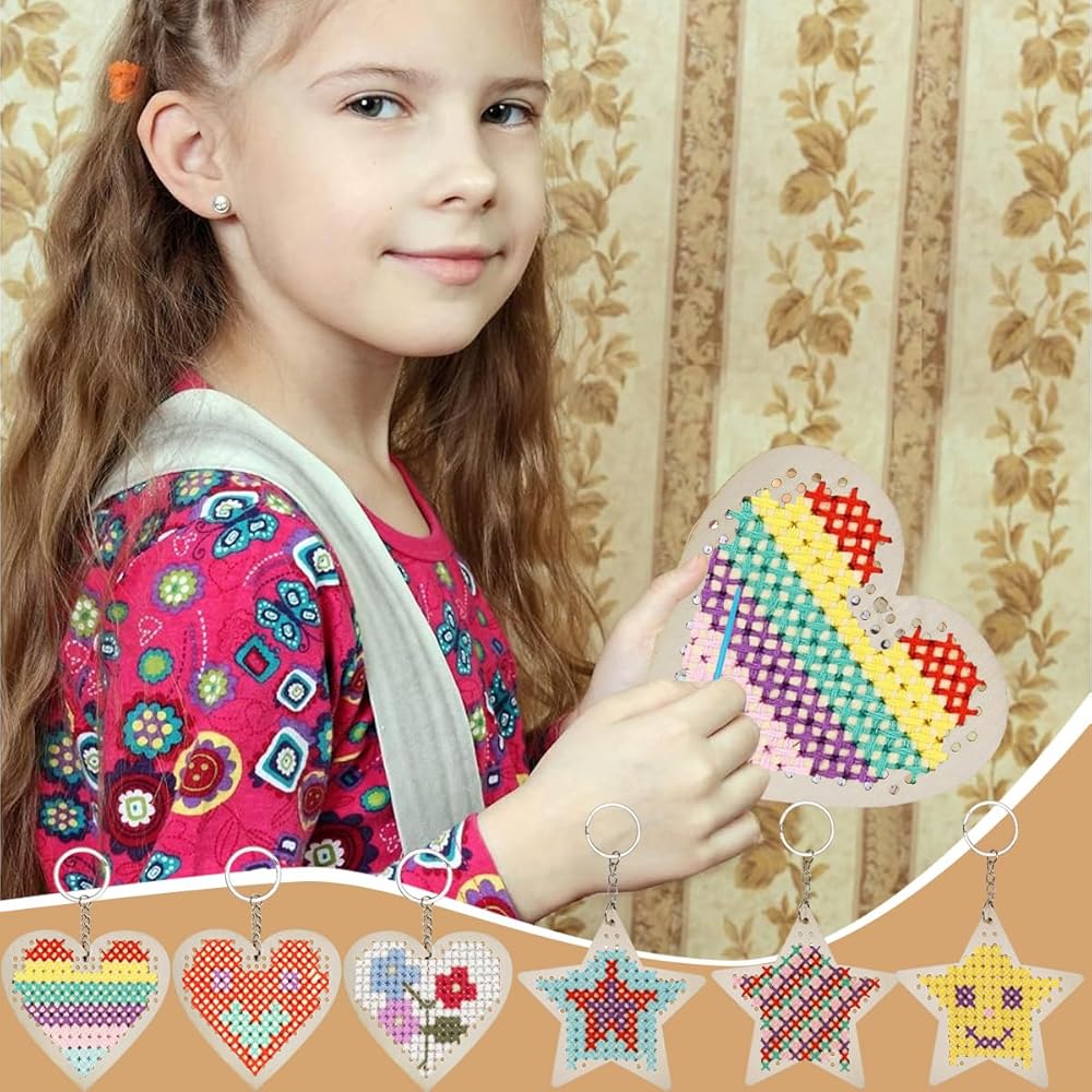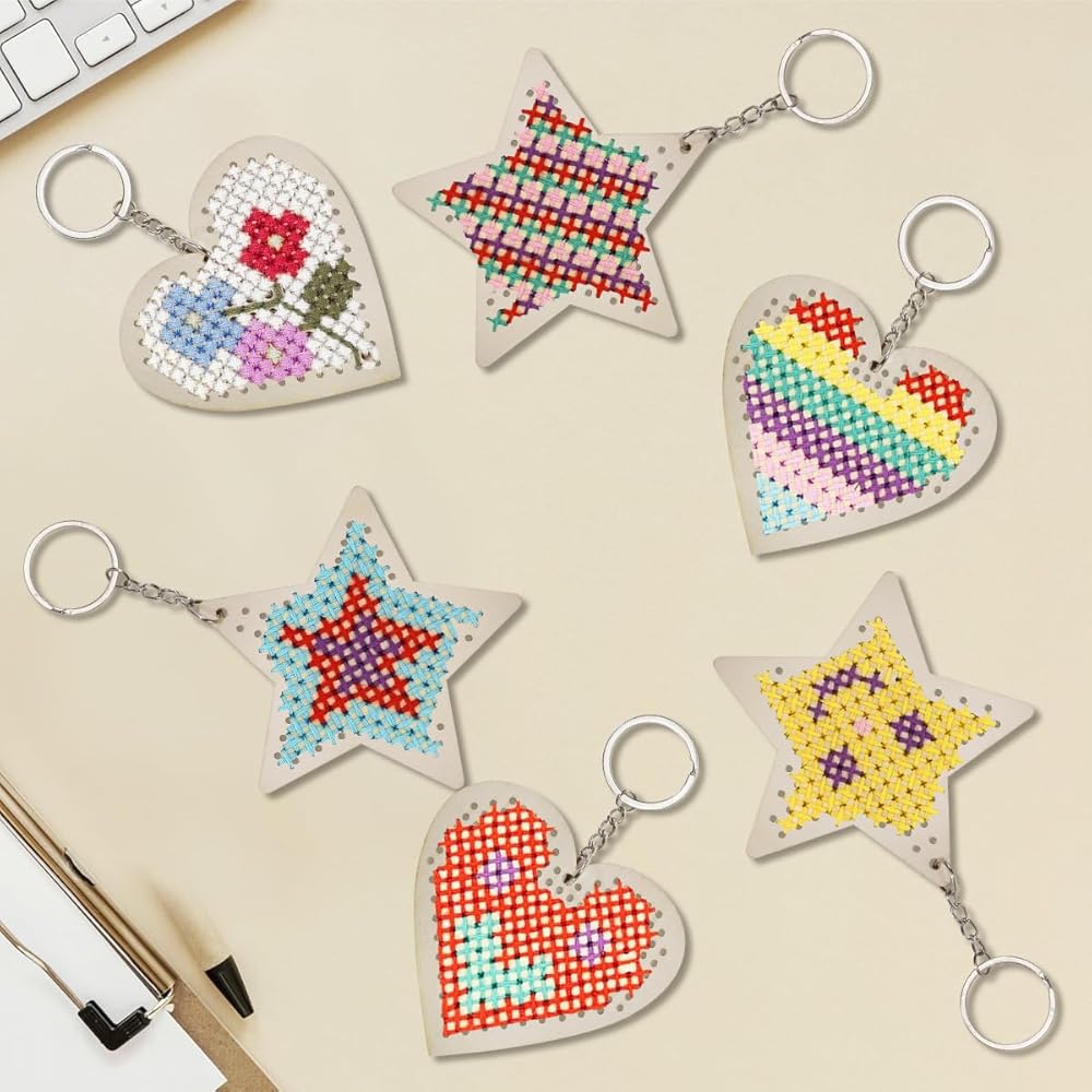 Gnognauq 6Pcs Wood Cross Stitch Kits Star Heart Wood Ornament with Cross Stitch Keyrings for DIY Crafts Embroidery Kit