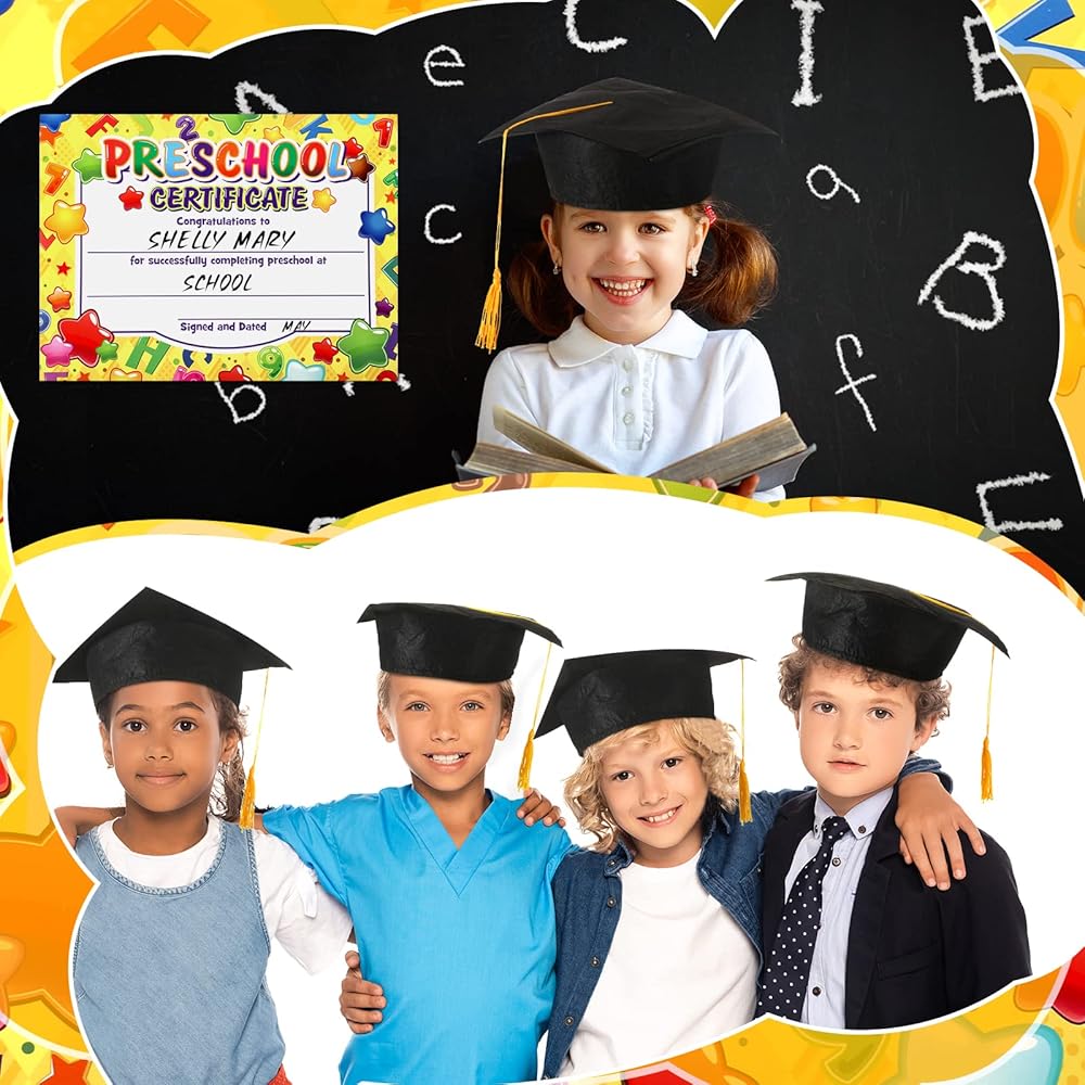 مجموعة غطاء التخرج: ستتلقى 24 قطعة من قبعات التخرج بحجم الطفل المصممة في Golden Tassel ، 24 ورقة من شهادة الجائزة ، مناسبة للاحتفال بإنجازات الأطفال ولحظات النجاح الكبيرة ؛ كمية كافية للطلاب لإكمال زخرفة حفل الاحتفال بالتخرج ، وهي طريقة لطيفة لتشجيع إنجازات الطلاب