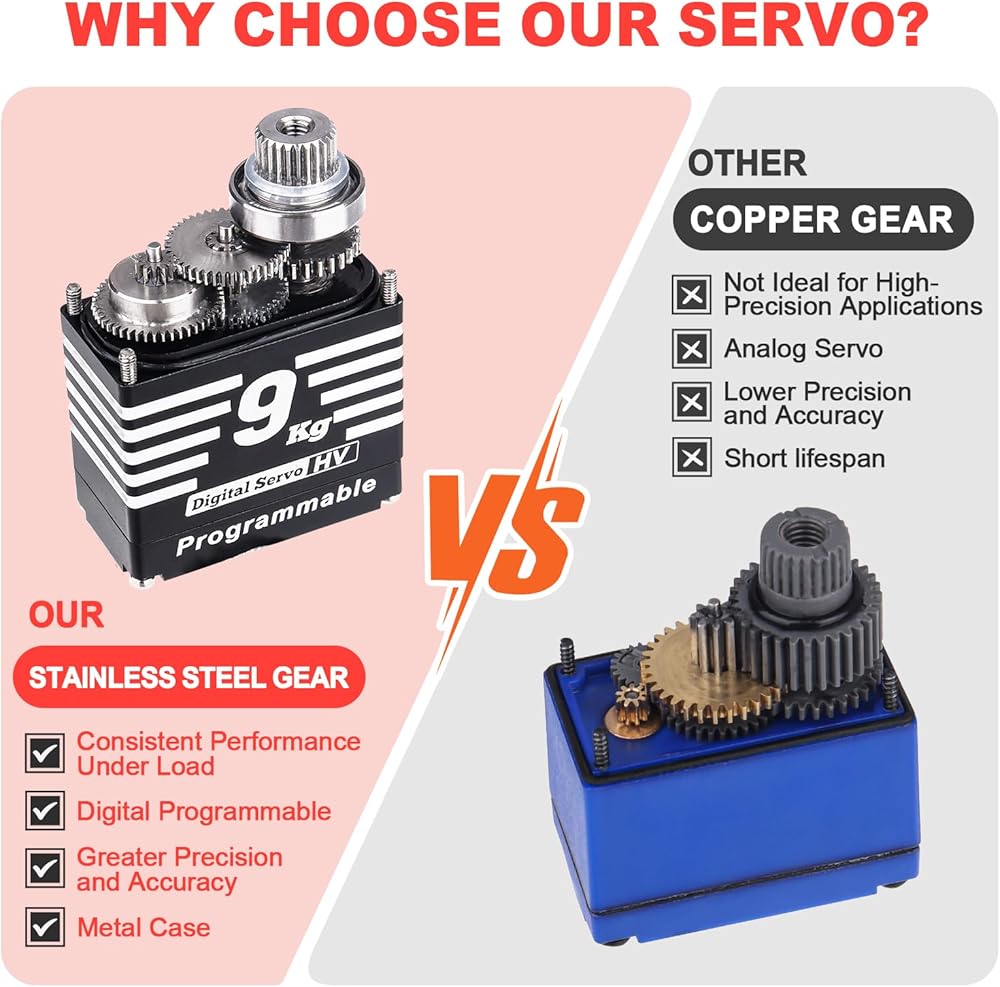 Programmable and Adjustable – The programmable feature allows for customization, enabling users to adjust the servo's performance to suit specific needs, ideal for RC hobbyists, robotics, and DIY projects.