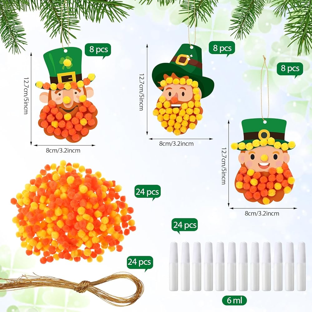 • Irish Day Crafts Ornaments : St. Patrick's Day Pom-Pom Crafts kits include everything you need to make fun St. Patrick's Day crafts; Each set includes 24 leprechaun background cards, 24 pom-poms, and 24 strings for hanging, plus a bottle of glue, so you can complete a classroom activity, family fun day, or a wholesome DIY home project