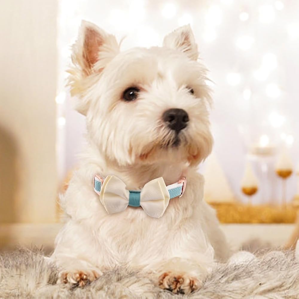 【PACKAGE CONTENT】You will receive 1pc adjustable dog collar, 1pc flower shape tie and 1pc bowtie, the flower and bow ties are removable, you can change according to your preference, 2 colors(blue white, pink blue) for your choice.