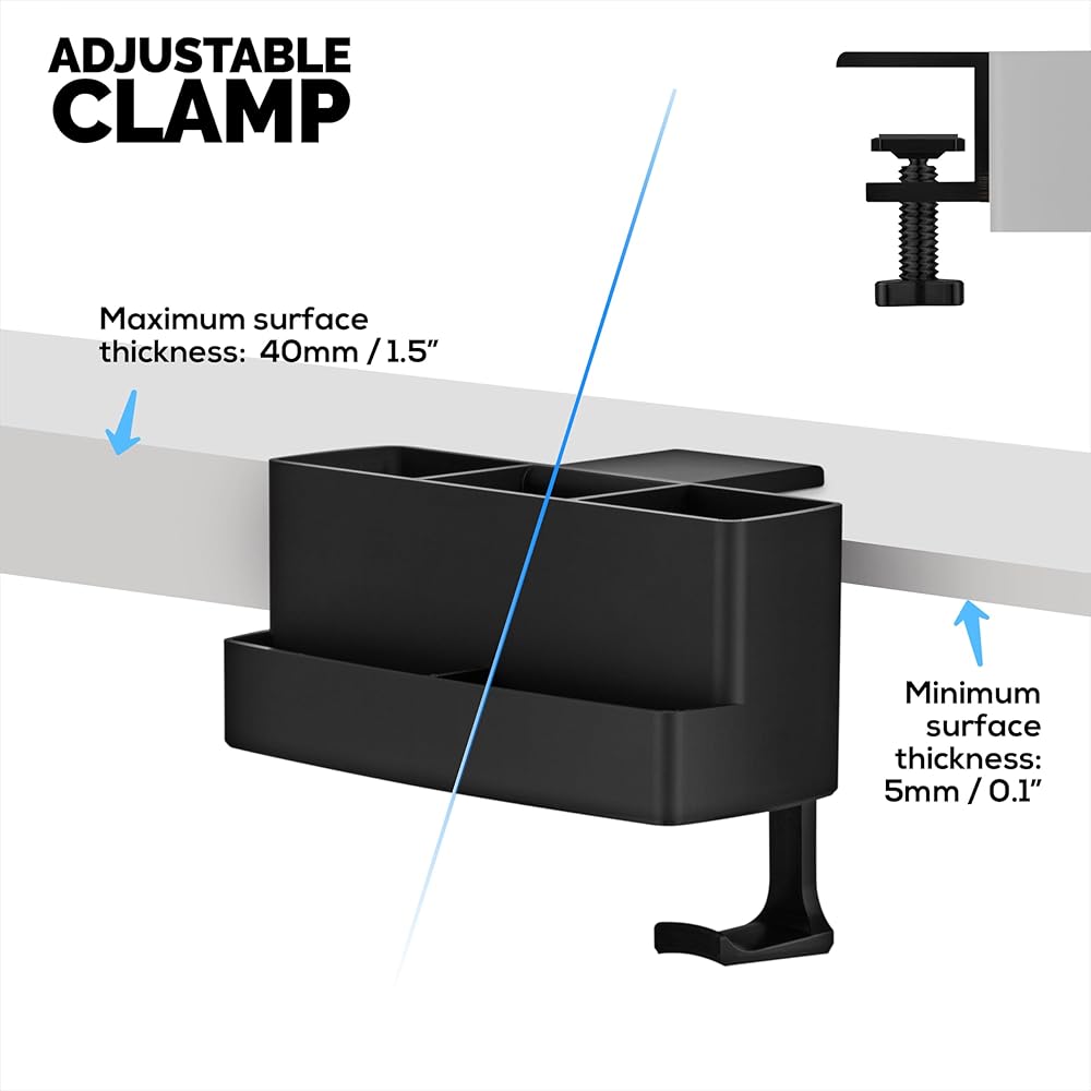 المشبك القابل للتعديل: يتيح لك مشبك السمك القابل للتعديل إرفاق المنظم بشكل آمن بحافة المكاتب أو الأرفف أو أي سطح مسطح ، مع نوبة قابلة للتخصيص لأسطح مختلفة تتراوح سمكها بين 0.1 إلى 1.5 بوصة. لا توجد مسامير أو أدوات مطلوبة - ما عليك سوى ارتكابها للتنظيم الفوري.