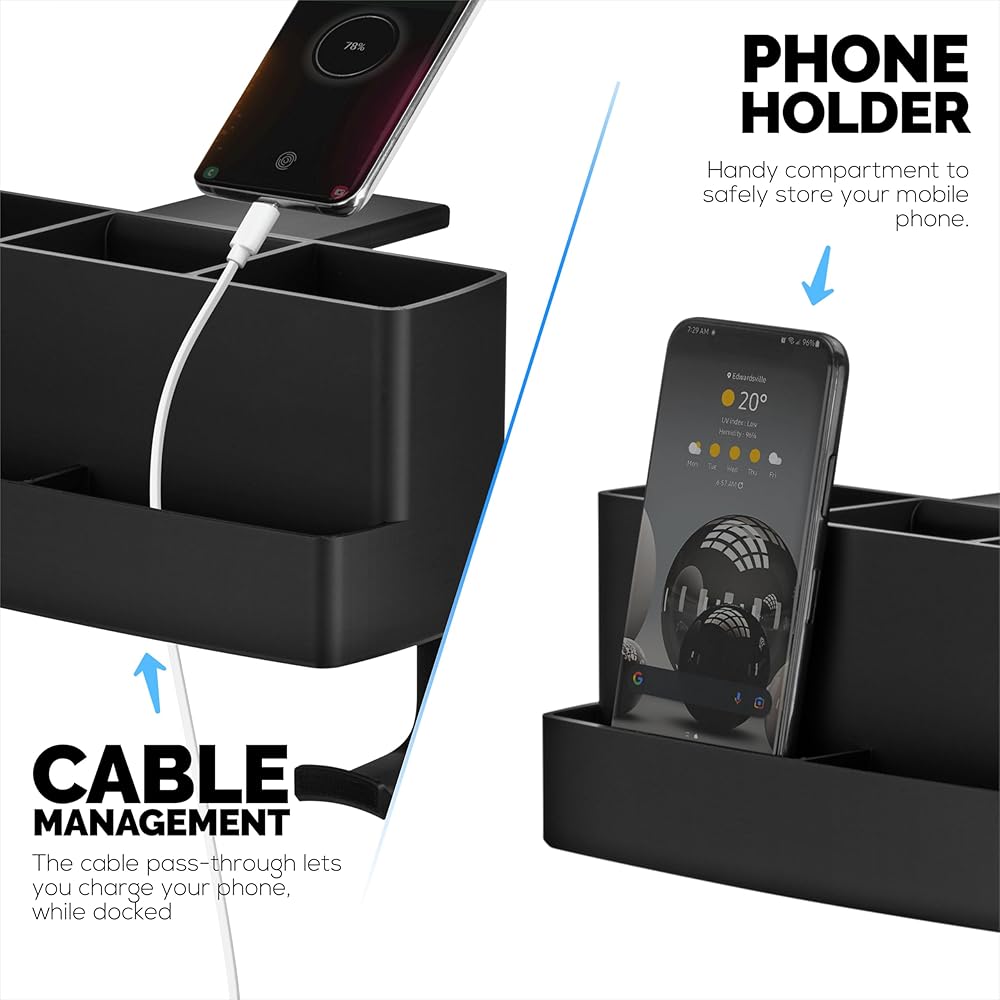 2 فتحات أمامية للهواتف المحمولة: تم تصميمها مع فتحتين أماميتين بحجمها تمامًا للهواتف المحمولة ، مما يجعل هاتفك متاحًا بسهولة ولكن خارج الطريق أثناء عملك. يتضمن أيضًا تمريرًا للكابلات وإدارة الكابلات.