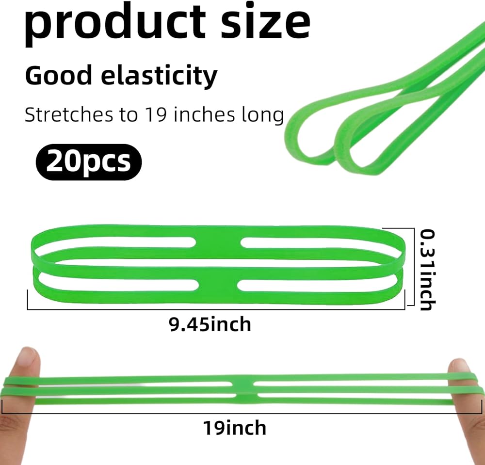 Size and Material: Our 20pcs silicone rubber bands, specifically the h-band silicone rubber bands, are 240mm long and 11mm wide. Made from high-quality silicone, they offer excellent stretch and maintain their shape over time. The pack features a lively mix of 10 colors, including green, orange, yellow, red, blue, gray, purple, light blue, black, and pink.
