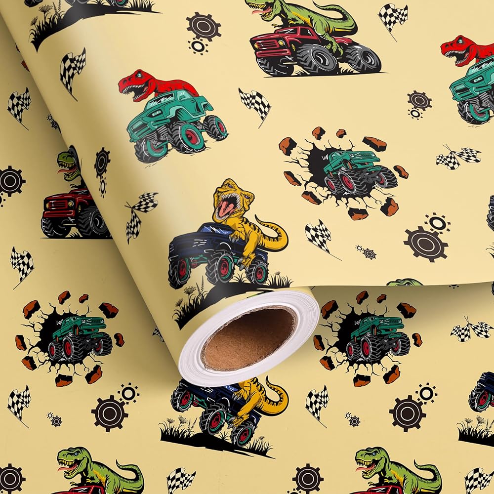 Dinosaur Driving Monster Truck Designs - تتميز بالرسوم التوضيحية لعوب الكرتون والألوان المائية ، تضيف أوراق التغليف هذه لمسة ممتعة وحيوية إلى أي هدية. مثالي للأطفال ومحبي الديناصورات.
