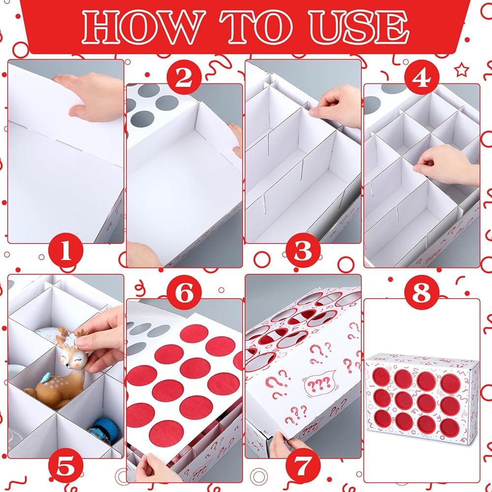 تتضمن لعبة لوحة Punch Punch واحدة 5 أجهزة كمبيوتر محفوظة مع 12 فتحة مقصورة و 5 مربع جائزة الورق الشمع لمربع هدايا لعد التنازلي لمدة 12 يوم للحفلة
