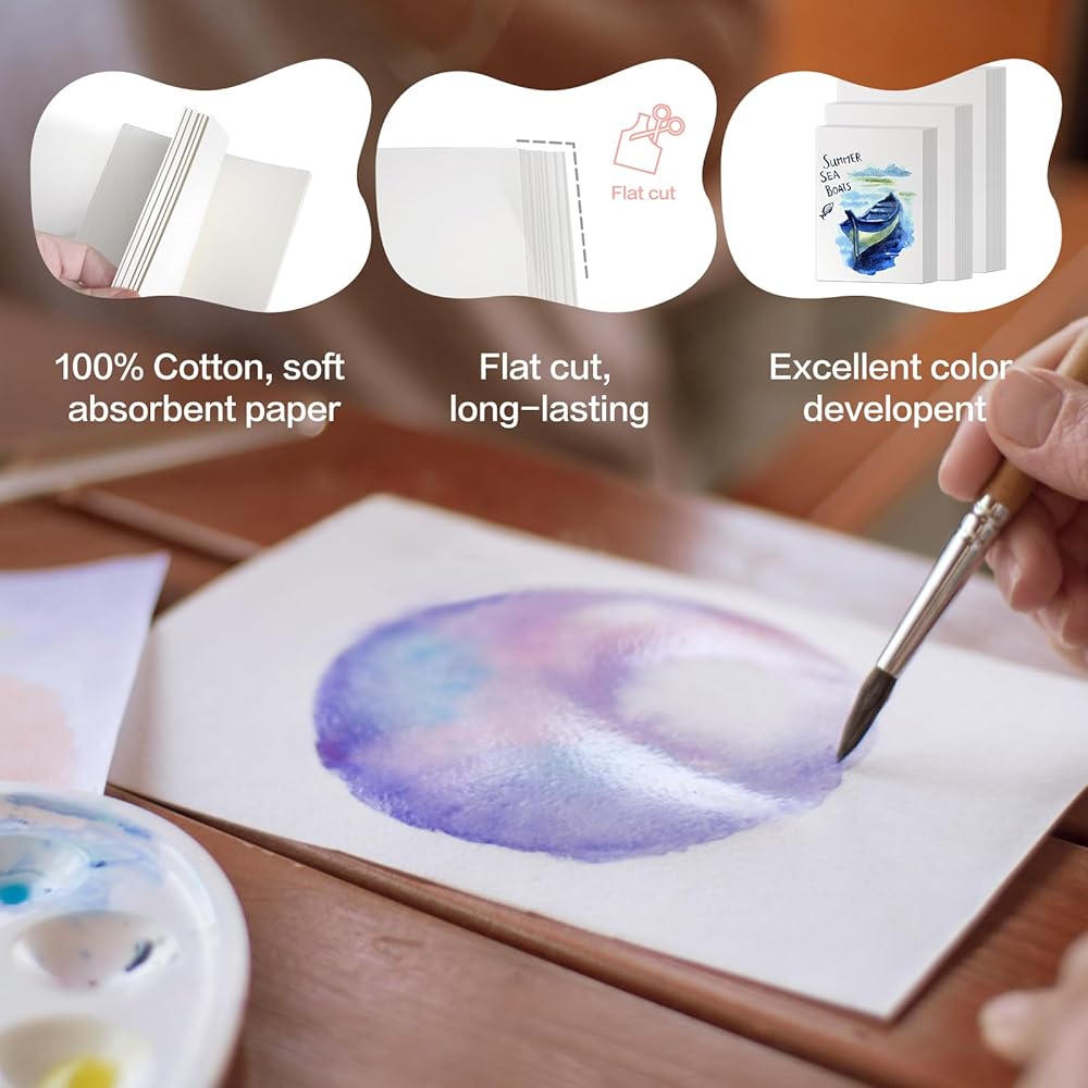 • امتصاص الصف الاحترافي: مصنوع من ألياف لب القطن الطبيعي الممتاز ، تتميز ورقة ألوان الماء هذه بخصائص استثنائية لامتصاص الماء وناشط. إنه يضمن أن لوحاتك مشبعة بألوان نابضة بالحياة وطبقات غنية ، من التدرجات الحساسة إلى التقنيات الجريئة الرطبة. تأتي كل ضربة على قيد الحياة مع حيوية لا مثيل لها ، مما يرضي مطالب الفنانين المحترفين والعشاق على حد سواء.
