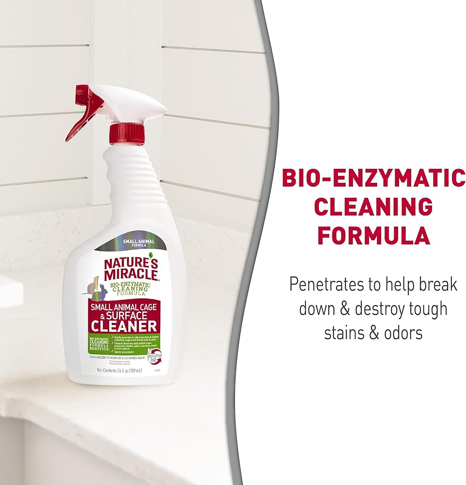 Nature's Miracle Small Animal Cage & Surface Cleaner cleans and deodorizes cages. This bio-enzymatic formula penetrates to help break down and destroy embedded, tough stains and odors. With OdorCapture 360 technology, this unscented formula removes odors instead of simply masking them with perfumes. It will not leave behind strong scents that can irritate bird or small animal respiratory systems. Safe for pets and home when used as directed, this formula also cleans and deodorizes accessories, feeders, fabrics, furniture, carpet and other surfaces.
