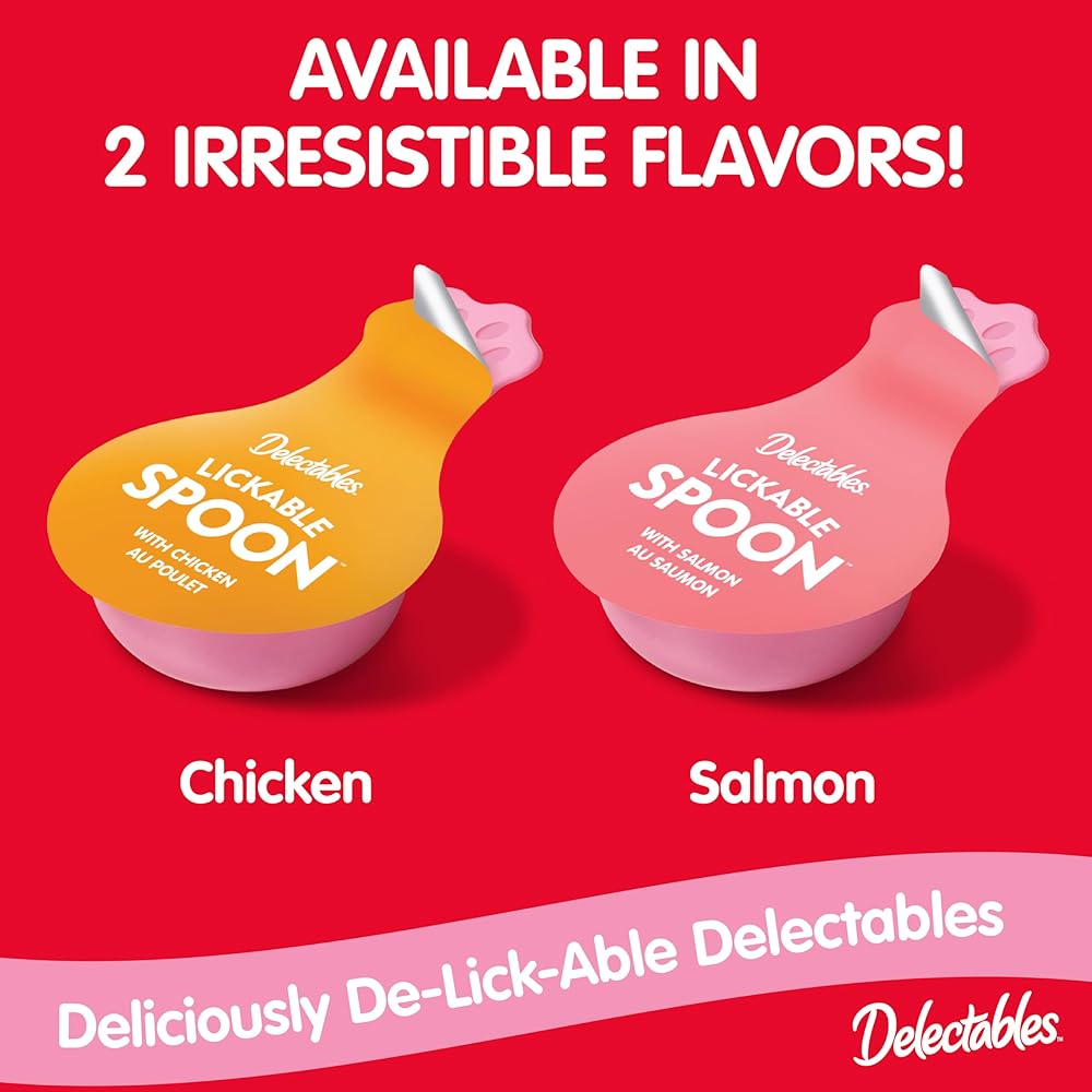 Delectables Lickable Spoon™ single-served handheld cat treats are so quick & easy that they'll fit in any time of your day.  This perfectly prepared portion of delicious creamy puree will have your cat licking with delight for fun and happy bonding moments together. It's so good, they'll lick it clean! …and love you for it. They're also grain-free with no added fillers, by-products, or preservatives. Available in two irresistible flavors; Chicken and Salmon. Deliciously, De-Lick-able, Delectables!