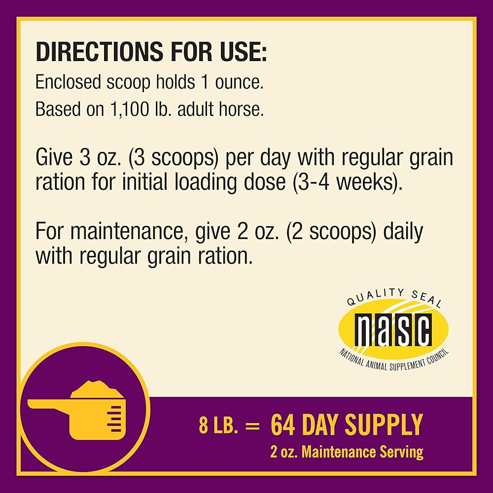 - المكونات المثبتة: يجمع بين الجلوكوزامين وكبريتات شوندروتن وفيتامين C والمنغنيز و MSM للمفاصل ؛ البيوتين ، الميثيونين ، ليسين ، والزنك للحوافر ؛ أوميغا 3 و 6 الأحماض الدهنية للجلد والمعطف.