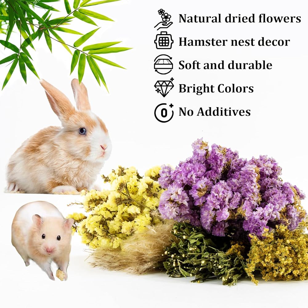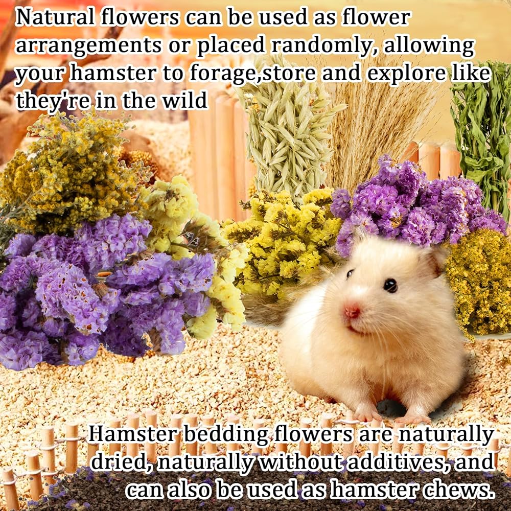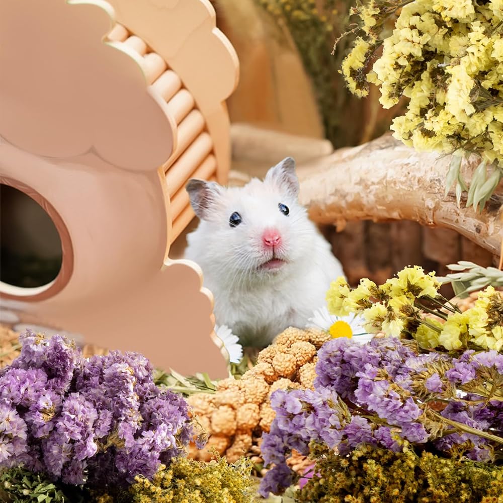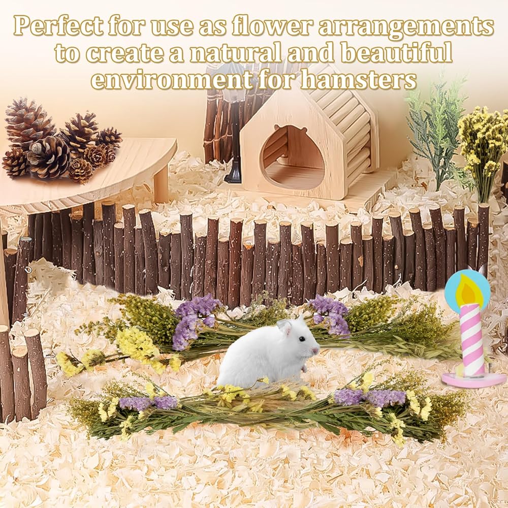 تزيين العش الهامستر: يمكن تخزين الزهور المجففة الطبيعية لفترة أطول من الزهور الطازجة ولا تتطلب أي صيانة. رذاذ الهامستر مناسب جدًا لتزيين أعشاش الهامستر. يمكن استخدامه كمسار للزهور خارج منزل الهامستر أو كزخرفة بجانب عش الهامستر.