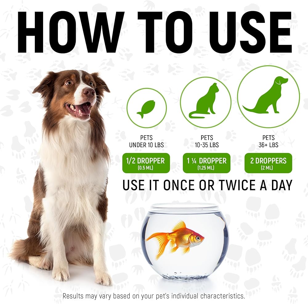 🧪 الجرعات والتطبيق - يهتم مخلبنا الذهبي بالحيوانات الأليفة "ووسائل الراحة للمالكين. لهذا السبب قمنا بصياغة شكل سائل يسهل تطبيقه: إسقاط في أفواه الحيوانات الأليفة أو الطعام.