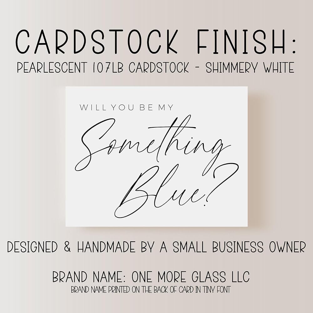• Every card is uniquely designed & beautifully handcrafted on luxurious pearlescent cardstock. They pair exceptionally with the premium baby blue envelopes provided & come fully assembled. They are folded and have the verbiage “will you be my something blue?” printed on the inside.