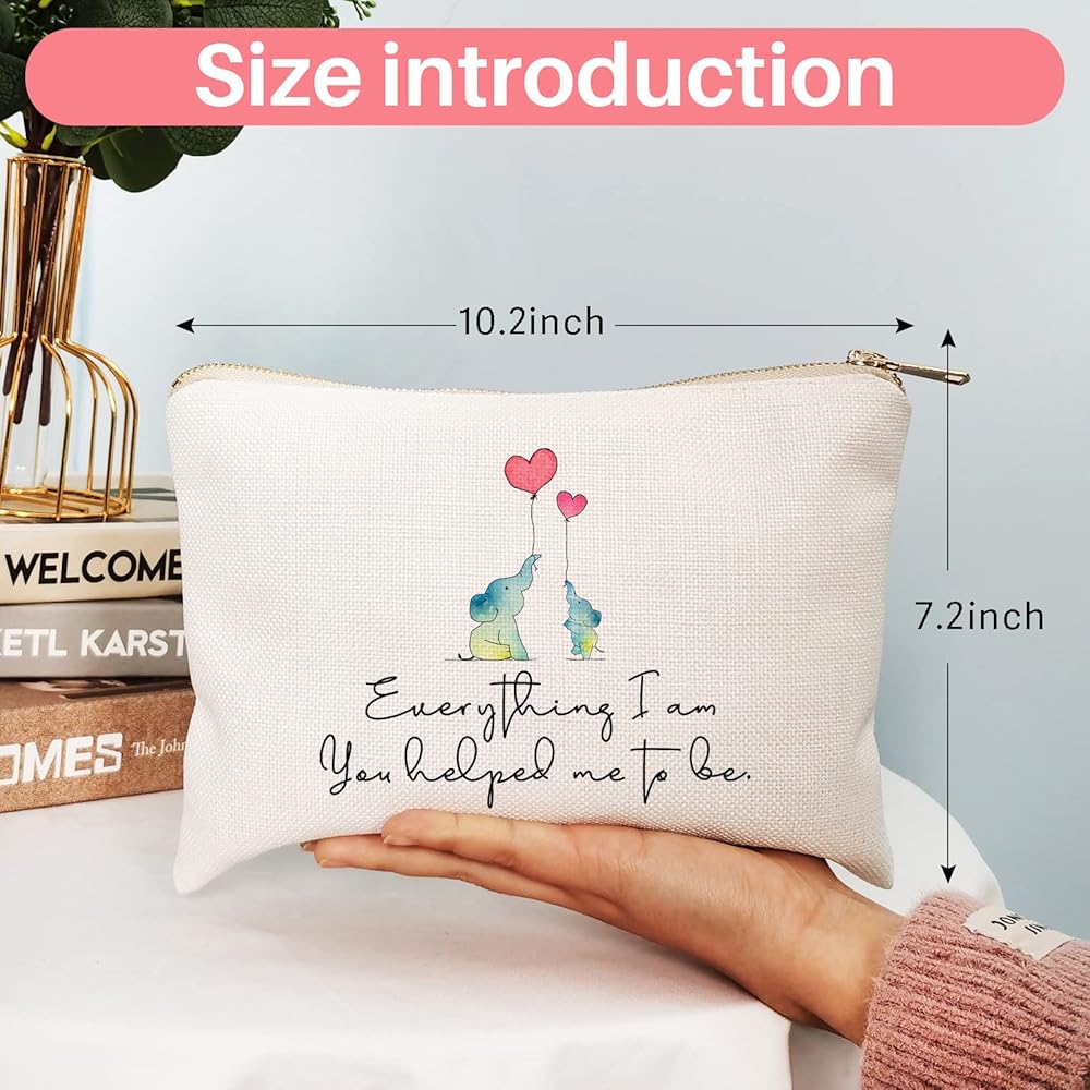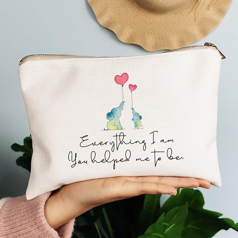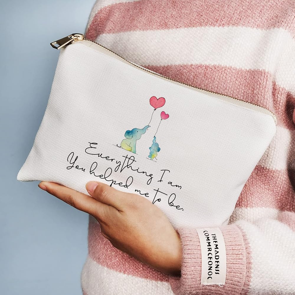 The "Everything I am You Helped Me to Be" Mom Makeup Bag is the perfect gift to show your mom how much you appreciate all that she has done for you. Featuring an adorable baby elephant with its mother, this toiletry bag is a beautiful reminder of the bond between a mother and daughter. The spacious and durable cosmetic bag is perfect for storing all of your mom's beauty essentials while on-the-go. Give your mom a heartfelt gift that she can use every day with this "Everything I am You Helped Me to Be" Mom Makeup Bag. It's also a great gift for Mother's Day or as a nursery elephant gift.