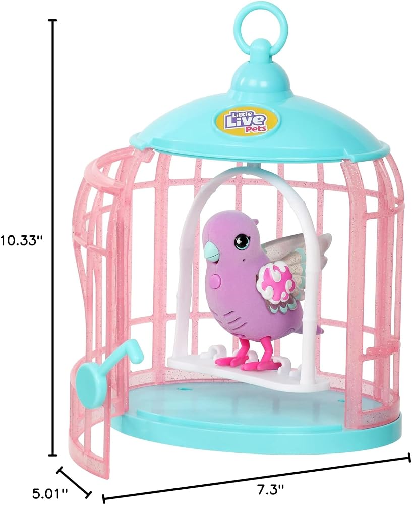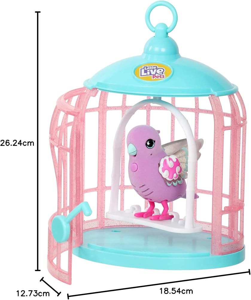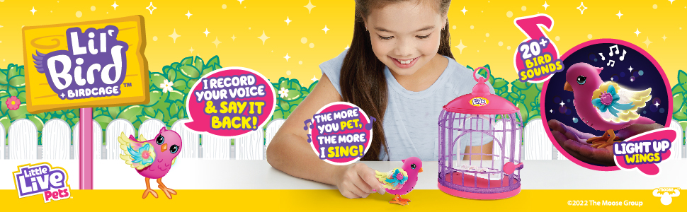 Little Live Pets - Lil' Birds are the sweetest birds you'll ever meet! These adorable little birds with big beautiful eyes and magical light up wings, come to life in your hands as you pet and interact with them. They really react to your touch! The more you pet, the happier your Lil' Bird will get! They will chirp and tweet for longer and eventually whistle a tune for you! Lil' Birds love to chat and repeat what you say! Press the Lil' Bird's talk button on its chest and say your message. Your Lil' Bird will repeat what you say! These colorful toy birds will brighten your day with over 20 bird sounds to sing! This season you Lil' Bird has magical light up wings! This Lil' Bird lives in her own adorable Bird Cage! The Bird Cage can sit on its stand or hang from its hook. Lil' Birds love to play and live in the Bird Cage! Each Lil' Bird has decorations and features on their wings and faces that relate to a certain theme. Collect Tiara Twinkles to add to your own fabulous flock!