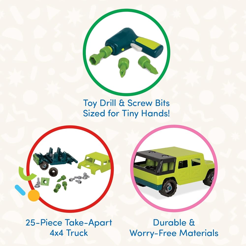 • Compatible with Wonder Wheels by Battat take-apart toys for kids (sold separately).Wonder Wheels by Battat: Toys with packaging made from recycled paper and soy ink.Size: Toy vehicle measures 10. 0 (L) 6. 25 (W) 6. 25 (H) inches approximately.2 x AA batteries required. Batteries not included.Age: Recommended for little mechanics aged 3 and up.Battat is a family-owned company and a classic toy brand
