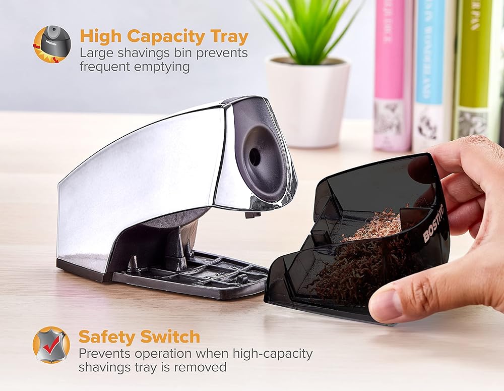 مفتاح الأمان - عند إزالة الدرج ، لا داعي للقلق بشأن مشغل المبراة. ما لم يتم إشراك الدرج ، فلن يتم تشغيل مبراة القلم الرصاص.