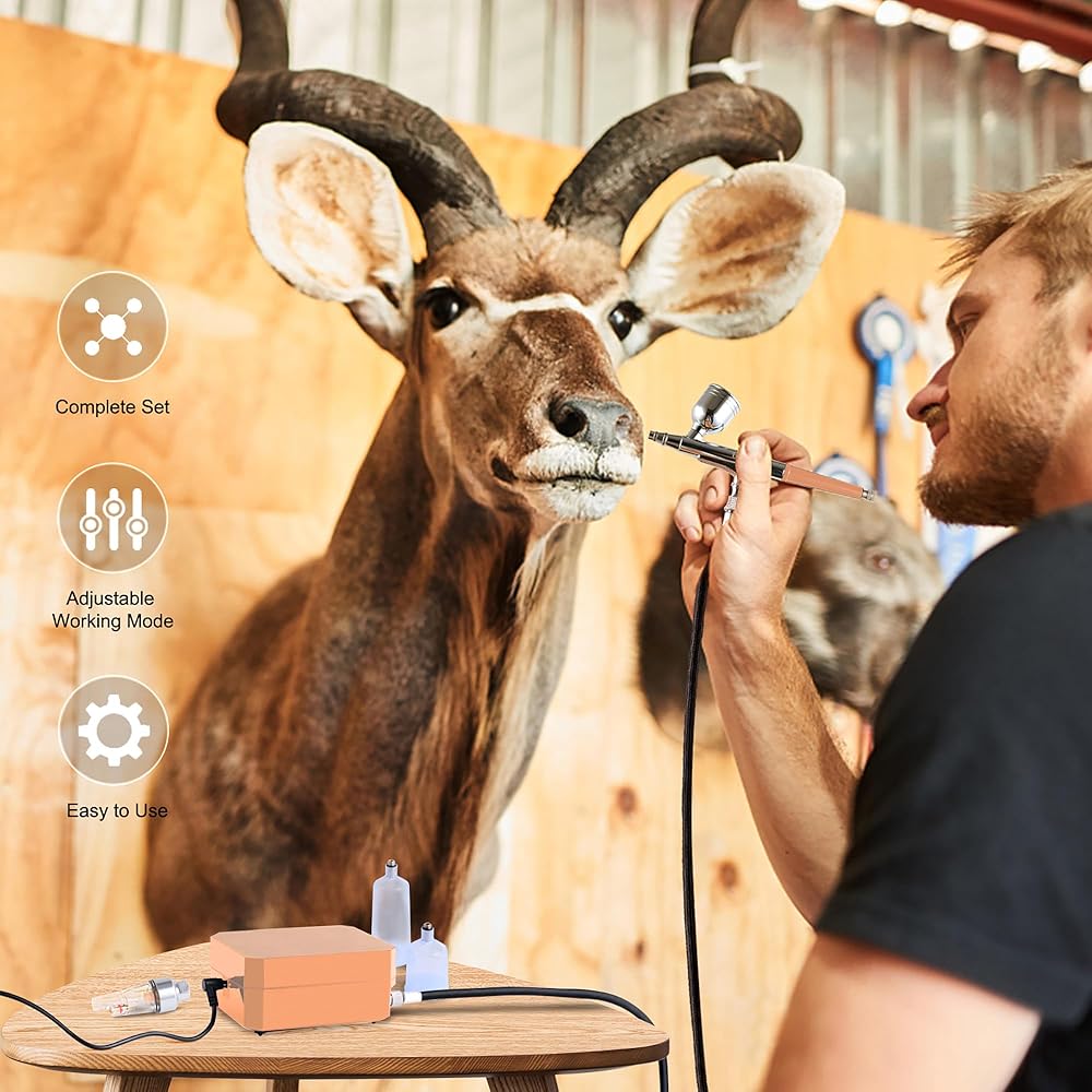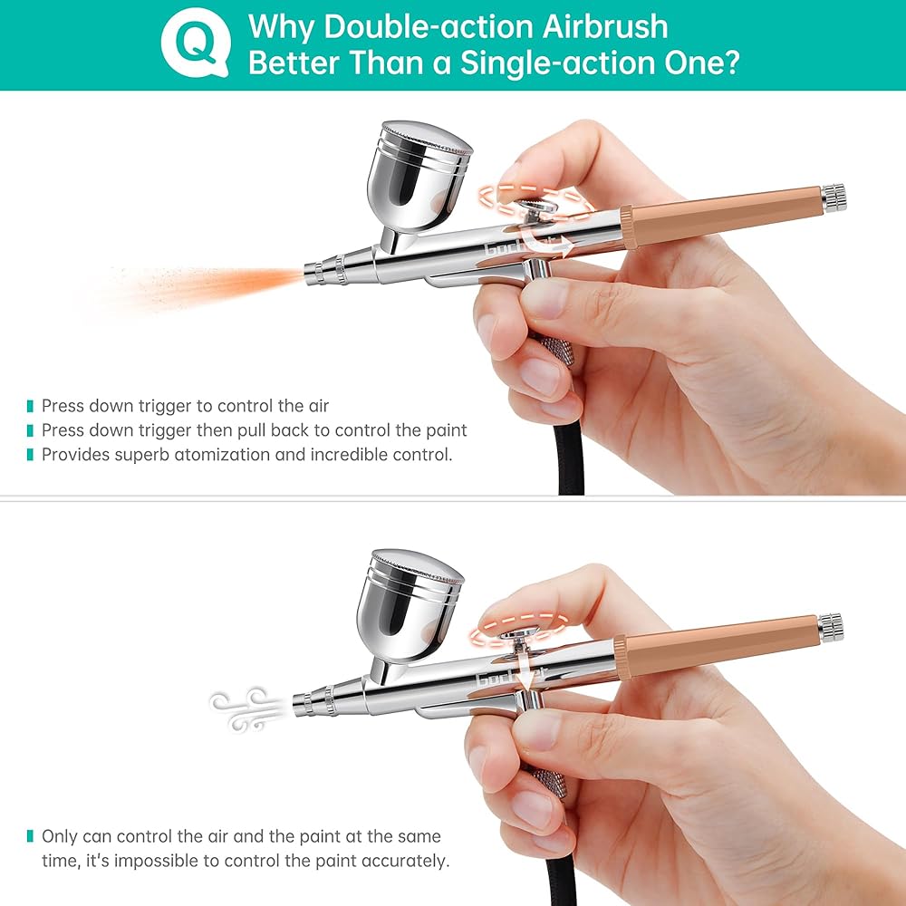 تصميم مزدوج الحركة: ضاغط البخاخة مع البخاخة المزدوجة ، مما يمكّن التحكم في السوائل خلال الجزء النهائي من بندقية البخاخة وتنظيم حجم الصباغ والهواء عبر الزناد على قلم البخاخة ، تجنب النفايات على طلاء حبر الحبر
