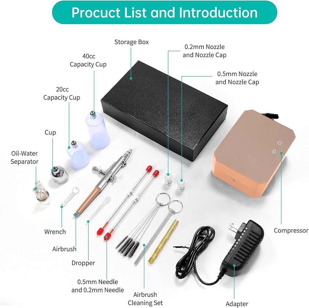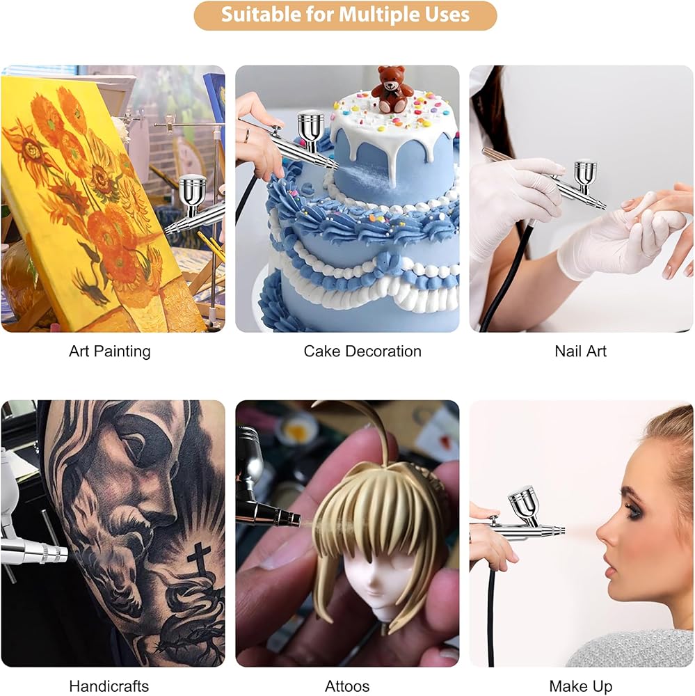 مجموعة فرشاة الهواء الكاملة: مجموعة واحدة فقط لتلبية جميع متطلباتك. تأتي مجموعة البخاخات الشاملة هذه مزودة بفاصل مياه زيت ، ومجموعة كاملة للتنظيف ، وأدوات التفكيك والتركيب ، وأكواب سعة 20cc/40cc وما إلى ذلك.