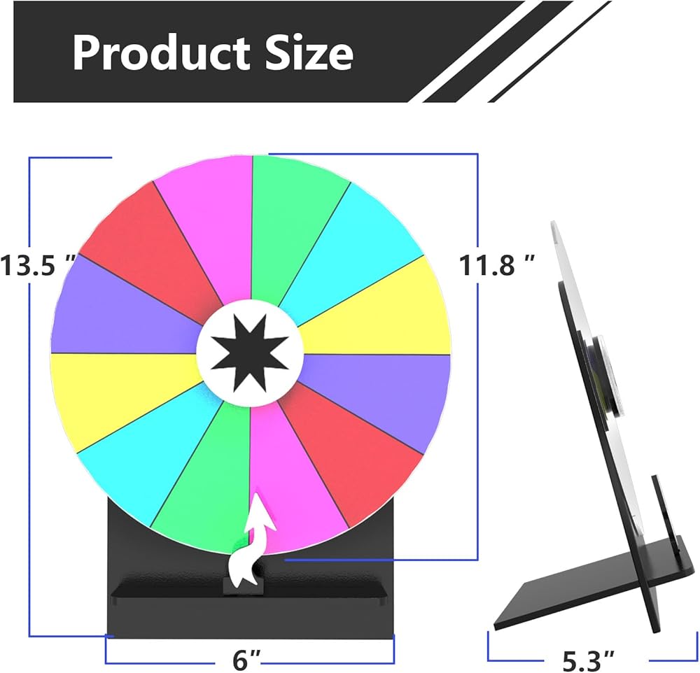 المتانة والاستقرار: تم تصميمه بقاعدة قوية ، وشريط دعم قوي ، وقبضة مطاطية ثابتة في القاعدة ، تضمن عجلة الجائزة لدينا التوازن وتدور ناعم وحرة في كل مرة. توفر الأوتاد المتينة والنقرات بين كل فتحة أيضًا تحكمًا أفضل في السرعة ، مما يضمن وجود بقعة عادلة وعشوائية في كل تدور.