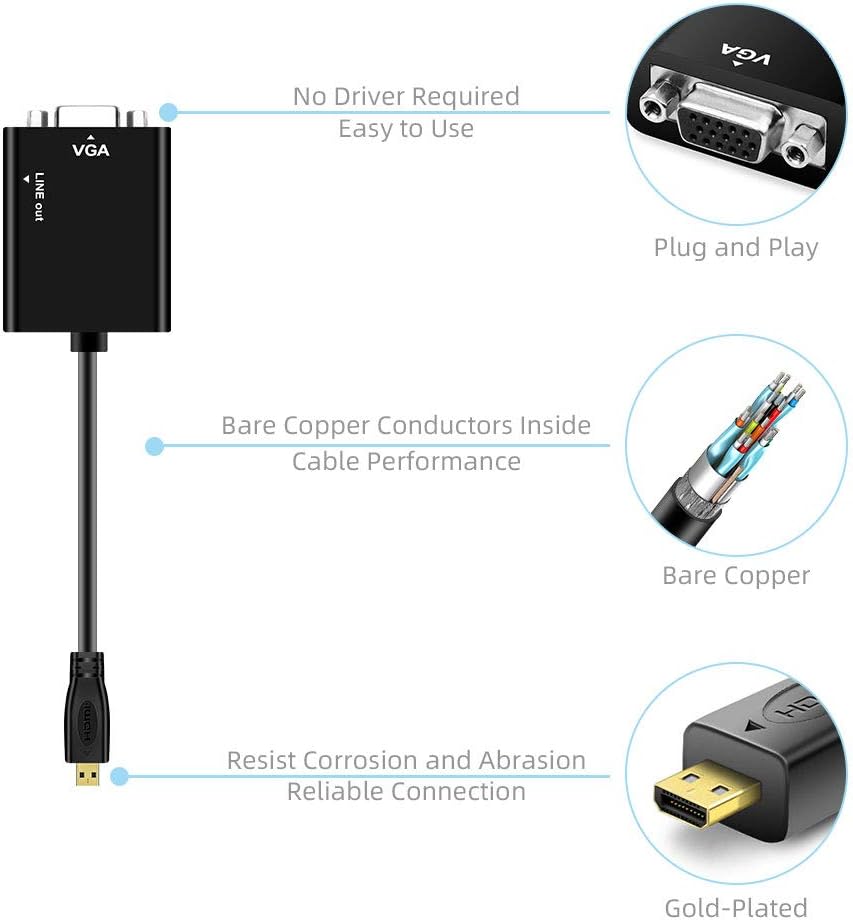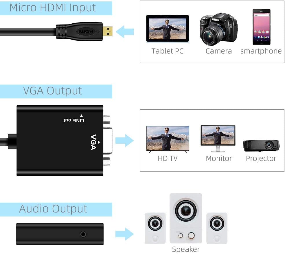 يمكن لمحول مايكرو HDMI إلى VGA ذكر إلى أنثى توصيل الأجهزة بمنافذ HDMI الصغيرة (مثل أجهزة التابلت والهواتف الذكية والكاميرات وما إلى ذلك) إلى شاشات منفذ VGA (مثل الشاشات وأجهزة التلفزيون وأجهزة العرض وما إلى ذلك)
