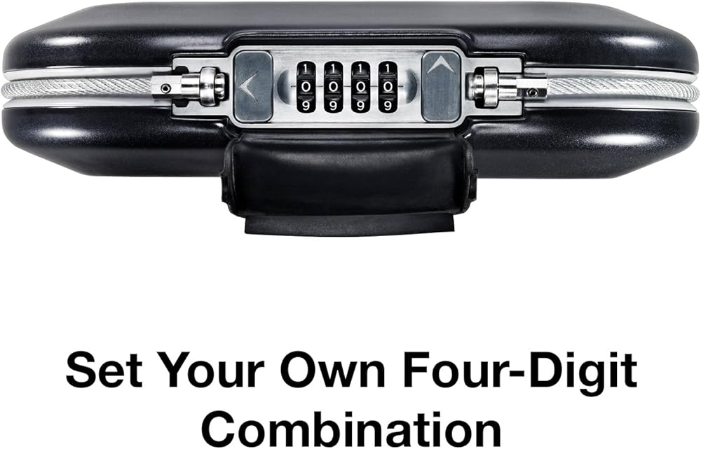 The Master Lock 5900D Set Your Own Combination Portable Personal Safe features durable construction made to withstand abuse and is water resistant. The safe measures 2-1/5in (57mm) H x 9-2/5in (23.9cm) W x 5-1/10in (13.1cm) D; and is ideal for recreation, campus, office, travel or leisure use. The safe includes a cable to wrap securely around a fixed object or use as a carrying handle. The Limited Lifetime Warranty provides peace of mind from a brand you know and can trust.