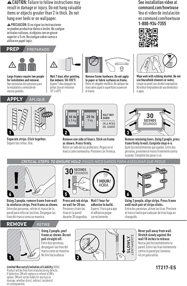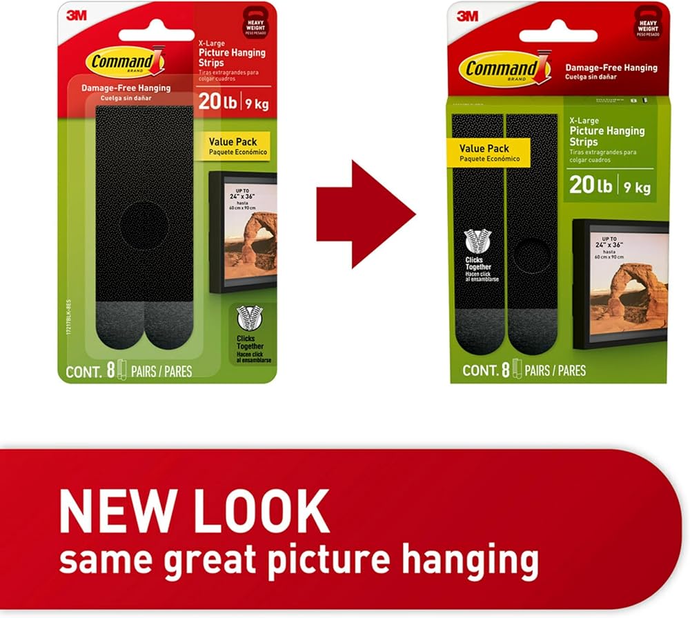 • الحد الأقصى لحجم الإطار 24 × 36 بوصة: تتضمن حزمة واحدة ستة عشر زوجًا (إجمالي ثمانية شرائط) من أوامر 20 رطلاً على شرائح معلقة للوزن الثقيل. أربعة أزواج شريط لاصقة على الحائط (ثماني شرائط) يحمل 20 رطلاً ؛ الحد الأقصى للإطار 24 × 36 بوصة