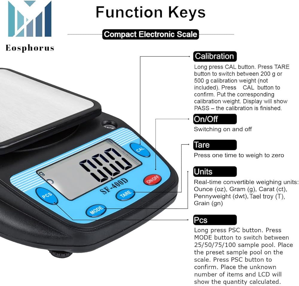 وحدات قياس متعددة - يدعم التوازن الرقمي لدينا 6 وحدات قياس لراحتك ؛ تشمل الوحدات المدعومة من القياس: أوقية (أوقية) ، غرام (ز) ، قيراط (CT) ، وزن القرص (DWT) ، Tael Troy (T) ، الحبوب (GN) ، وحساب القطعة (PCS) ؛ كما أنه يتميز بمربع كبير (4.7x4.7 بوصة) مقلاة مصنوعة من الفولاذ المقاوم للصدأ ، ومستوى الفقاعة المضمّن في القاعدة ، وأرجل التسوية غير القابلة للتعديل غير القابلة للتعديل