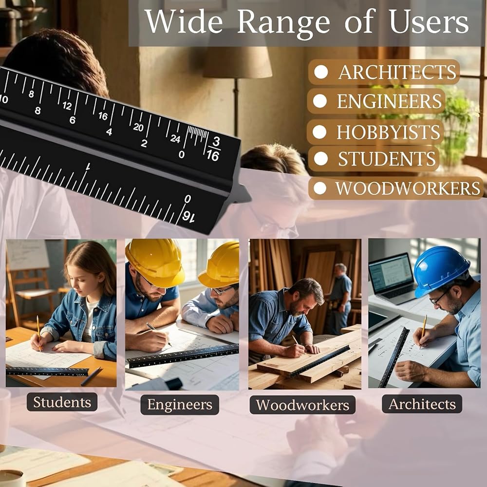 4 【تصميم ثلاثي كلاسيكي】 حاكم المثلث لديه 3 جوانب و 6 نسب مختلفة ، جميعها معايرة قبل مغادرة المصنع ، الدقة العالية ، أداء مستقر لحاكم المقياس الهندسي ، والضغط ومقاومة التآكل ، لا تشوه.