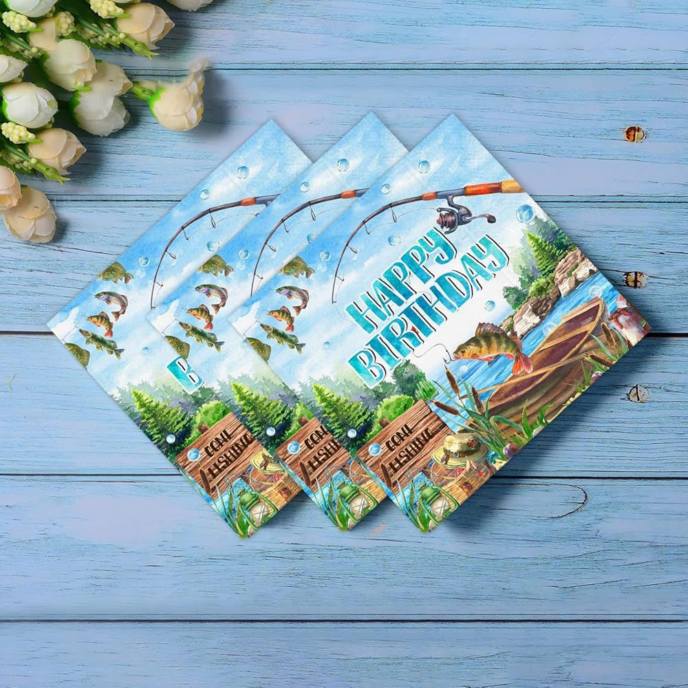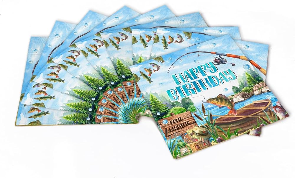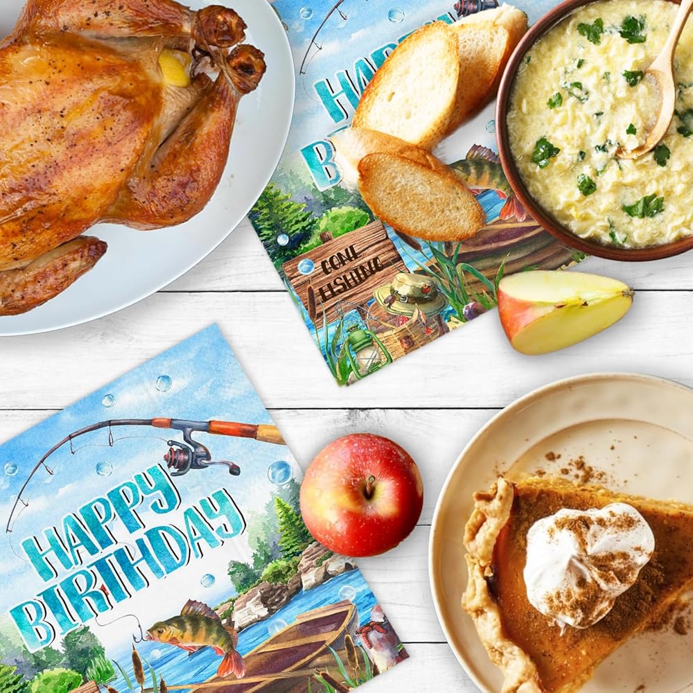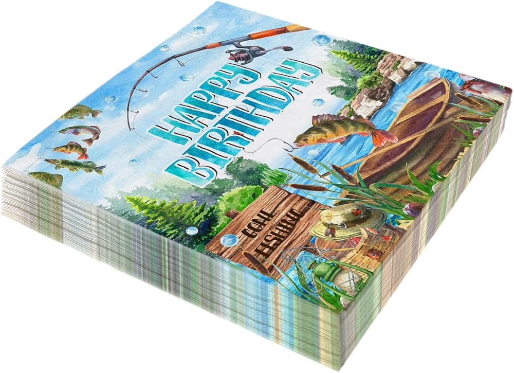 تصميم موضوع الصيد: مناديل الممتع والفريدة من نوعه في صيد الأسماك التي تضيف الإثارة إلى أي حفلة عيد ميلاد ، وخاصةً مثالية للاحتفالات التي تحمل عنوان الصيد.