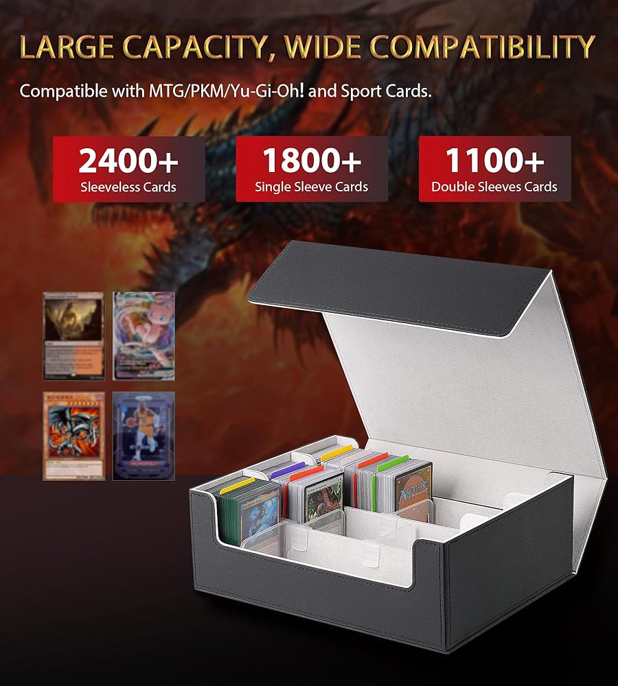 مربع سطح البطاقة الكبير للسعة-قياس 11.42 × 9.84 × 4.92 بوصة ، يحمل صندوق البطاقة أكثر من 2400 بطاقة تداول غير مستقرة ، أو 1800+ بطاقات أحادية اللون ، أو 1،100+ بطاقات مزدوجة الأكمام. ملاحظة: إنه غير متوافق مع اللوادر الكبرى أو أصحاب المغناطيسي