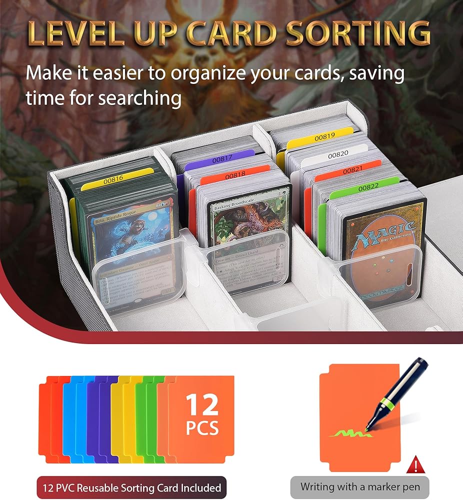 منظمة بطاقات التداول الفعالة - يتميز صندوق تخزين بطاقات التداول هذا بـ 12 مقسمًا و 4 سدادات انزلاقية للحفاظ على البطاقات منتصبة ومنظمة. يضمن الإغلاق المغناطيسي القوي أن يبقى مغلقًا بشكل آمن ، حتى لو انقلب رأسًا على عقب ، مما يوفر حماية موثوقة ضد الأضرار
