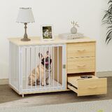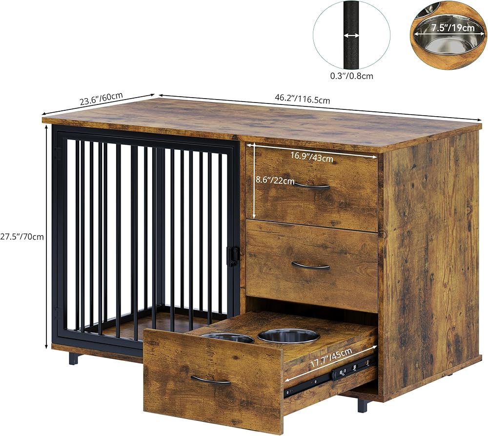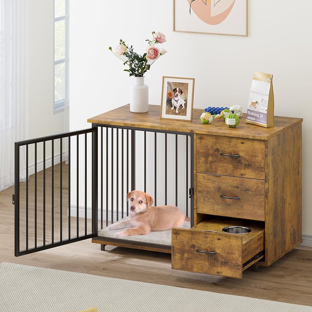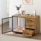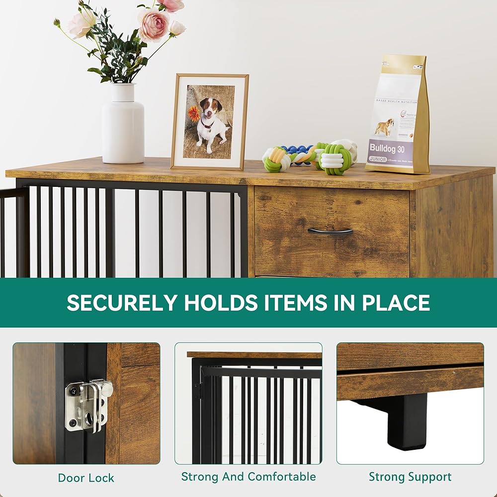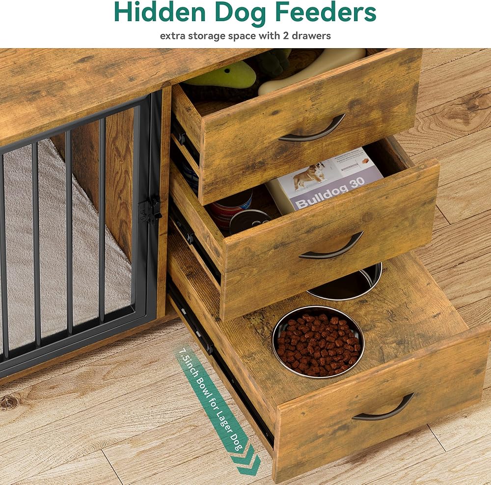 قفص الكلاب متعدد الوظائف مع الأدراج: يضم أثاث قفص الكلاب درجتين كبيرتين لتناول طعام الكلاب أو ألعابه ؛ يمكن أيضًا أن تعمل كحامل تلفزيوني وطاولة جانبية ذات سطح علوي واسع لعرض الزخارف وغيرها