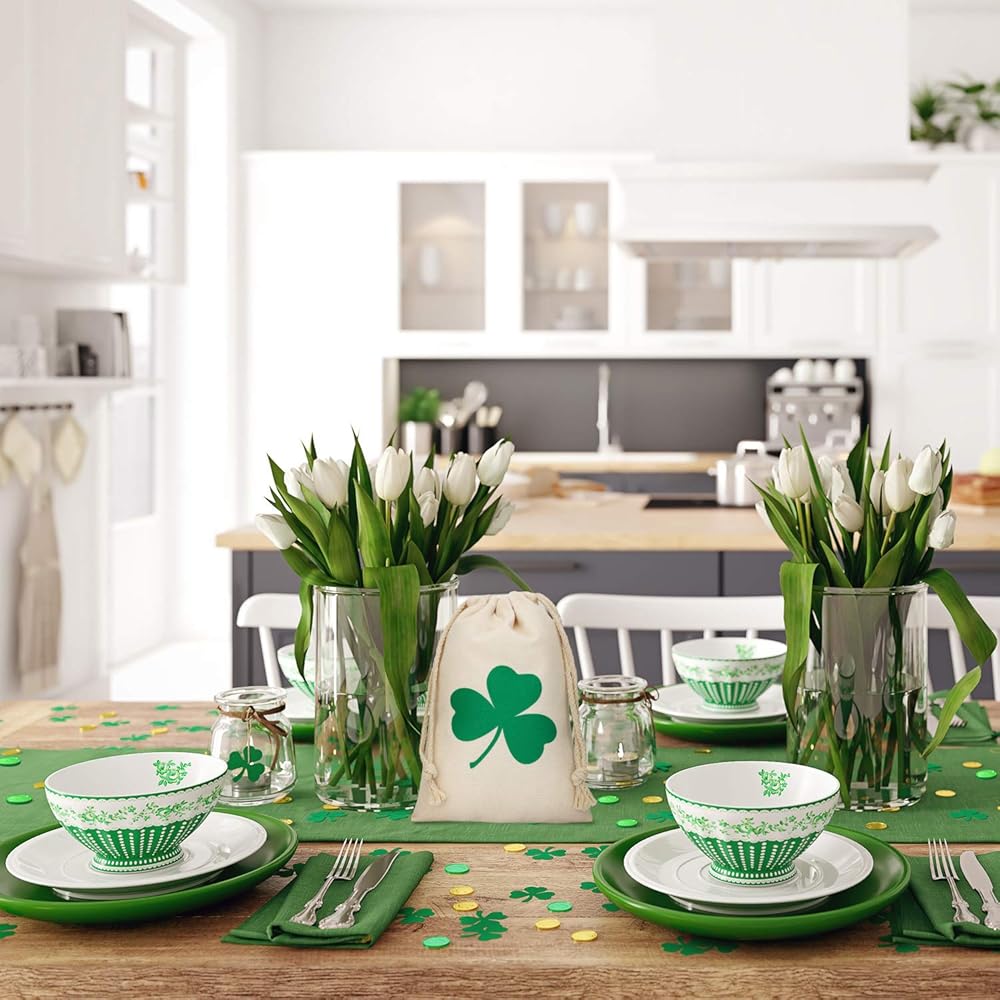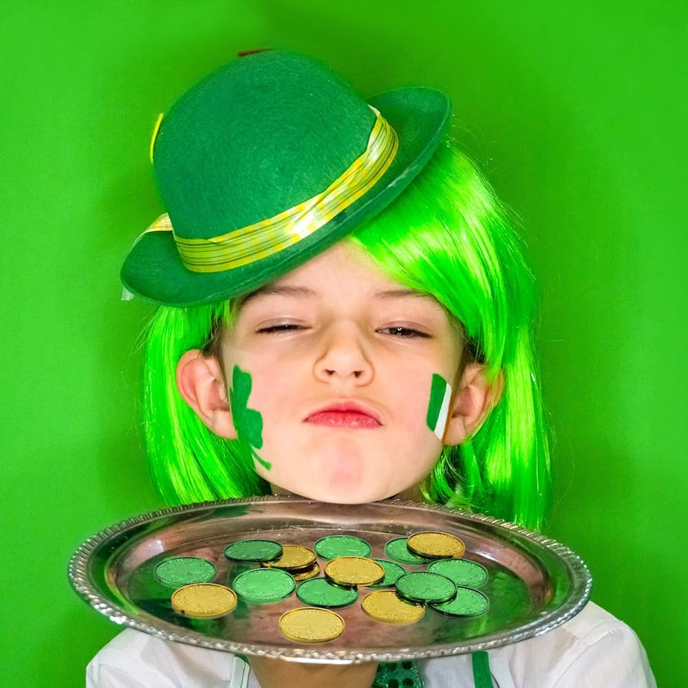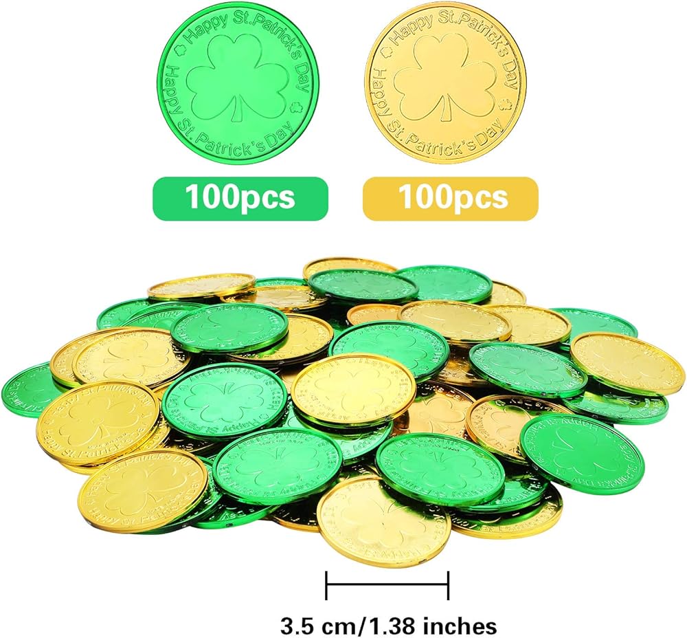 لوازم عيد القديس باتريك: يمكنك استخدام عملات شامروك والكيس معًا أو بشكل منفصل لأغراض مختلفة ، يمكن أن تنتشر العملات الذهبية البلاستيكية والعملات الخضراء على الطاولة لخلق جو احتفالي ، ويمكن ملءها في جرة زجاجية ويمكن تطبيقها على ألعاب St. Patrick التي تزينها في يوم St. Patrick.