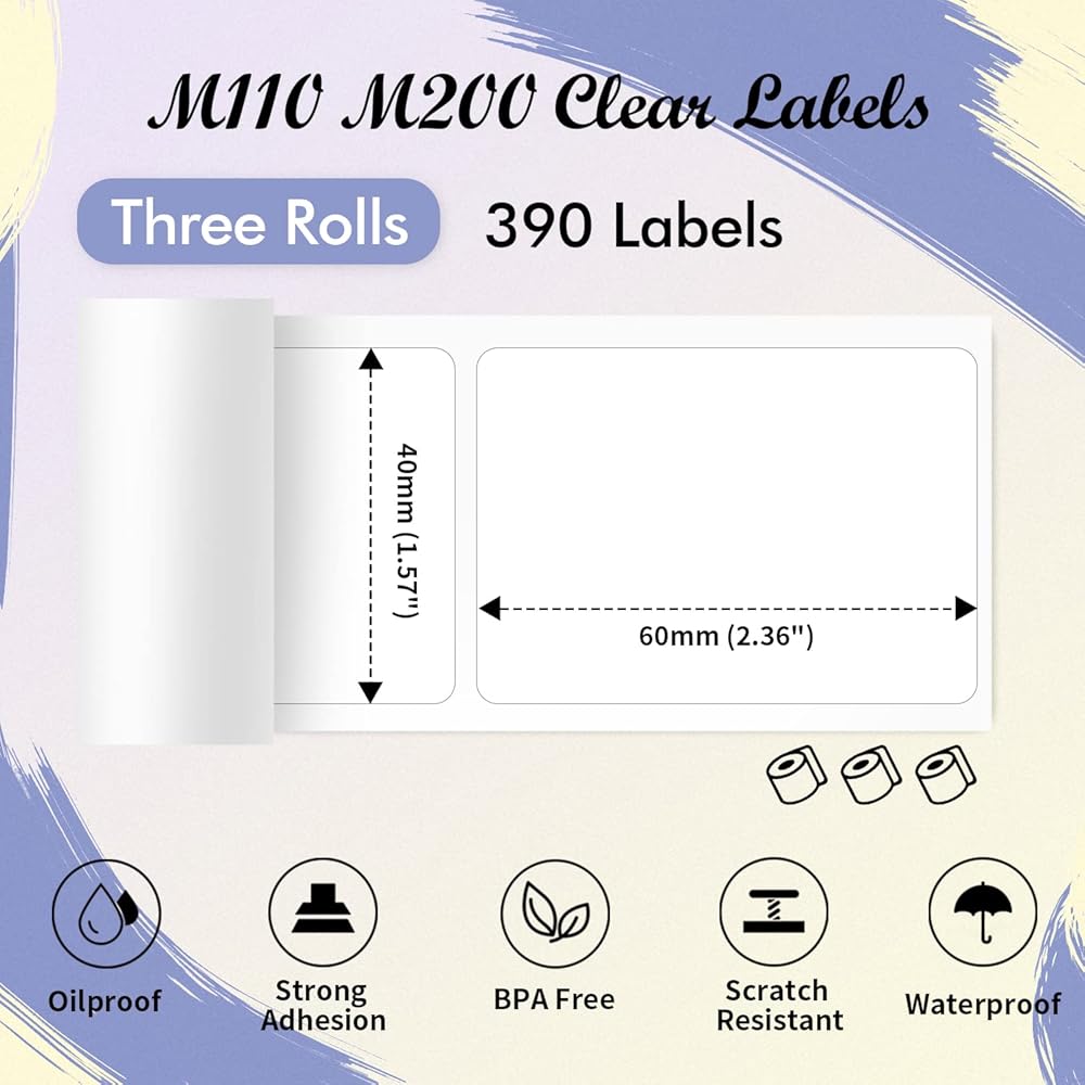 تفاصيل التسمية: ملصقات الملصقات الحرارية الحجم: 1.57 "x2.36" (40mmx60mm)/label ، 130 علامة/لفة ، 3 لفات (390 علامة) في المربع ، لون الملصق: واضح ، لون طباعة للأنماط والخطوط: الأسود