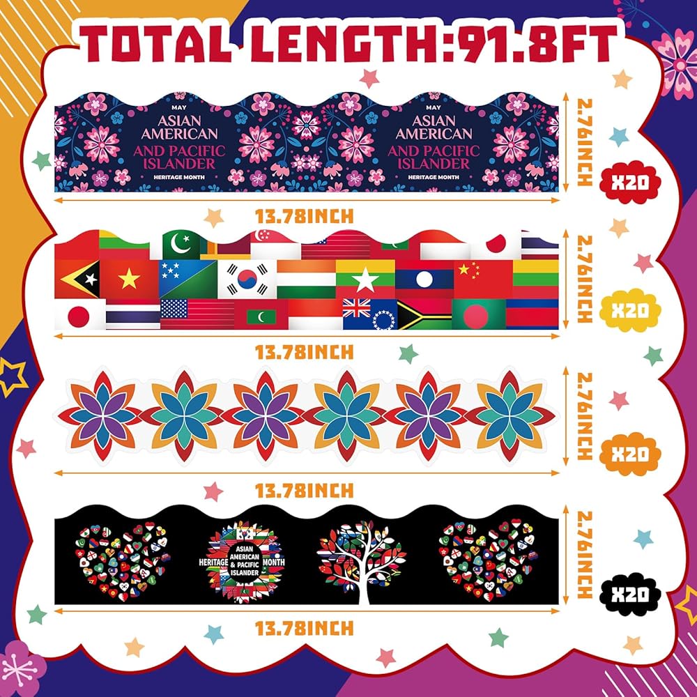 • Classroom Decoration: with the Asian American and Pacific Islander heritage month bulletin board borders, you'll receive a pack of 80 pcs; Each measures about 13.8 x 2.8 inches, reaching a total length of almost 91.8 feet; This large quantity and size ensure you have enough borders to decorate any classroom, office, or home