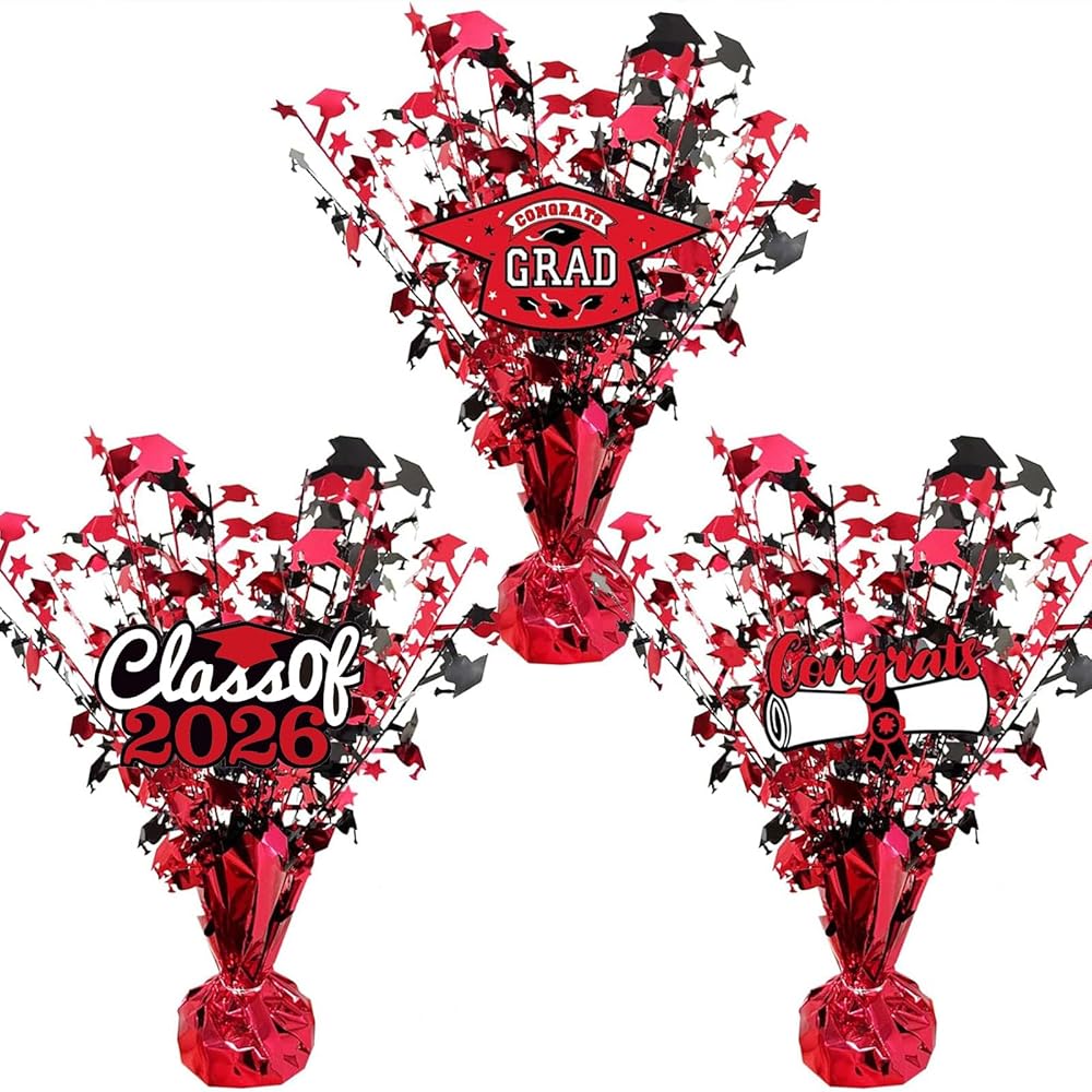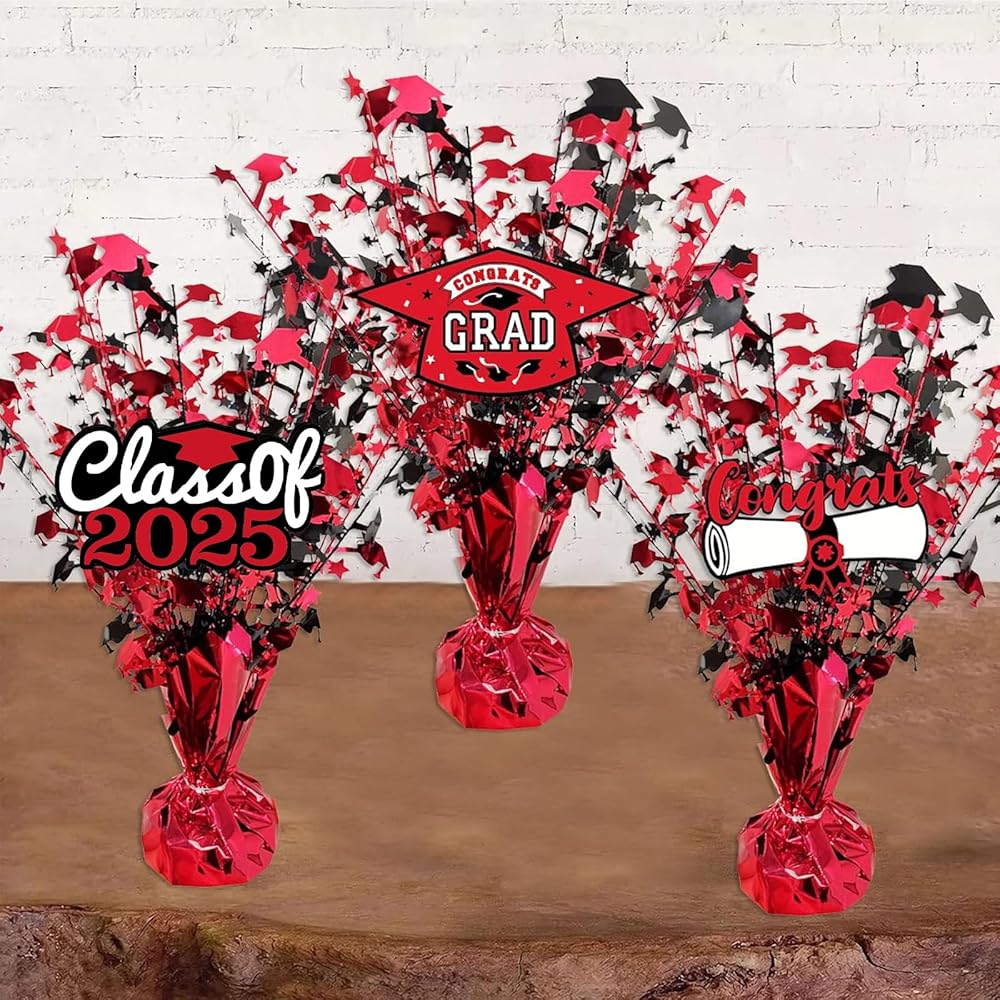 3 أجهزة كمبيوتر تخرج مركزية - قطع البالون مركزية الأزرق اللمعان بريق الخريجين مركزيات مركزية لعام 2025 زخارف طاولة التخرج (أحمر)