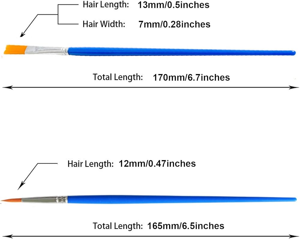 -[Inside Package] - 60 paint brushes(30 round Brushes+30 flat Brushes) [Size] - - The round Brushes hair length: 11-12mm / 0.43-0.47inches—— Total Length: about 165mm / 6.5inches.The flat Brushes Hair Length: 13-14mm / 0.5-0.55inches-——Total Length: about 170mm / 6.69inches..Note: Due to the difference between different monitors, the picture may not reflect the actual color of the item. Thank you!