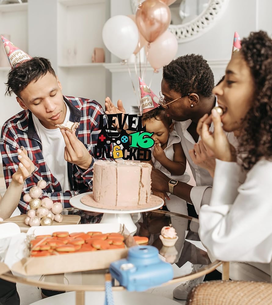 HIGH QUALITY MATERIAL: Level 15th Unlocked birthday cake decorations is made of high quality black glitter cardstock, the glitter won't fall off. There is also glitter on the back side with food grade paper sticks. Level 15s up birthday cake topper is ready to decorate the top of cake for that special game video theme birthday!